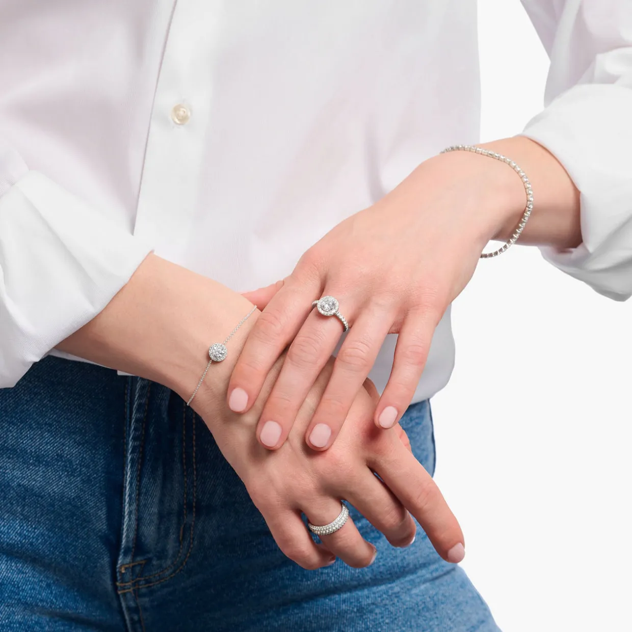 - Halo ring, large brilliant-cut zirconia stone, small round-cut zirconia stones, 925 silver, gently rounded ring shank for comfortable wear