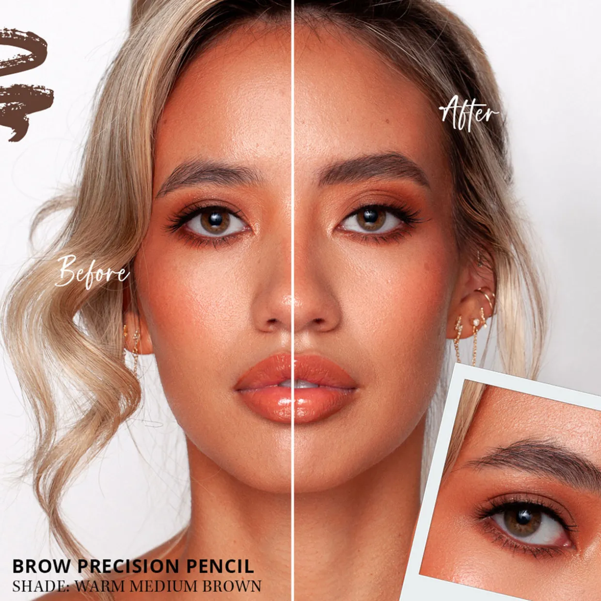 Our NEW Brow pencil is a hybrid between the pencil and diamond shapes we usually see in the brow world. We wanted to create a pencil that had the best of both – the diamond shape allows you to fill and cover the brow area quickly, but the size being similar to a pencil style allows for precise application and the ability to mimic actual brows hairs. – Keilidh