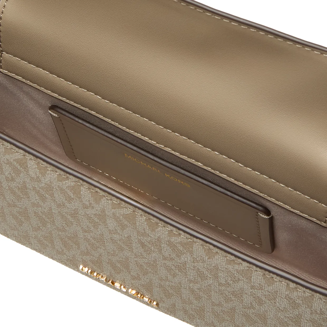 - Detachable chain shoulder strap, adjustable detachable crossbody strap, inner flap closure, front logo lettering, MK logo motif, gold-tone hardware, tonal stitching, grained leather finish
