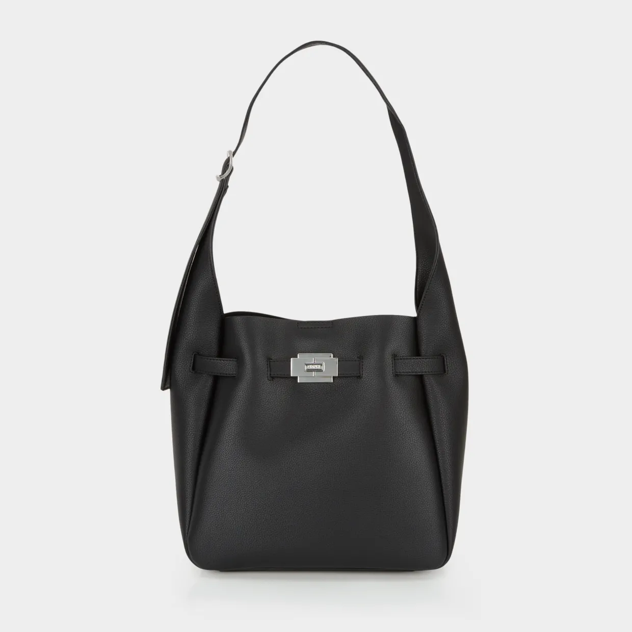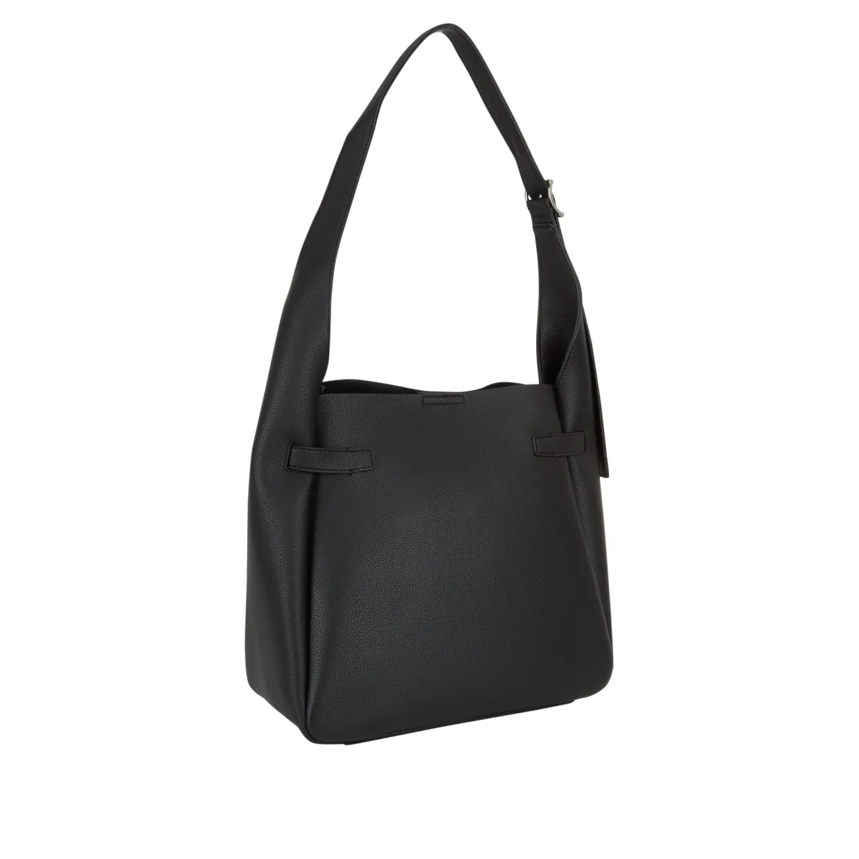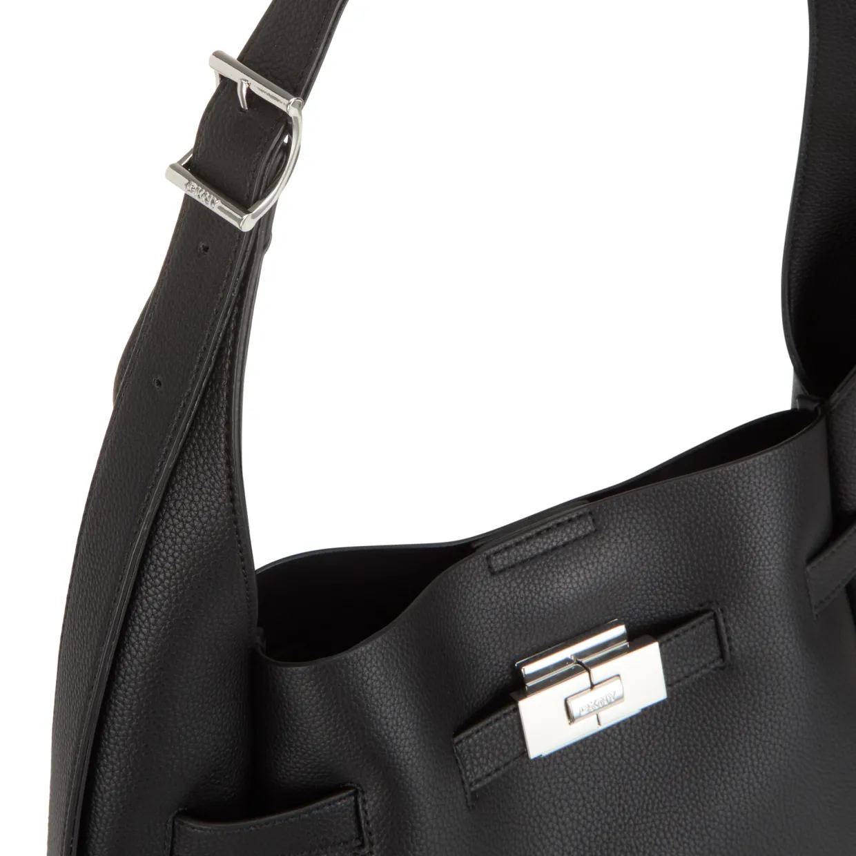 - Adjustable shoulder strap, clasp and belt detail, magnetic dot closure, silver-tone hardware, slouchy silhouette, logo details, pebbled finish