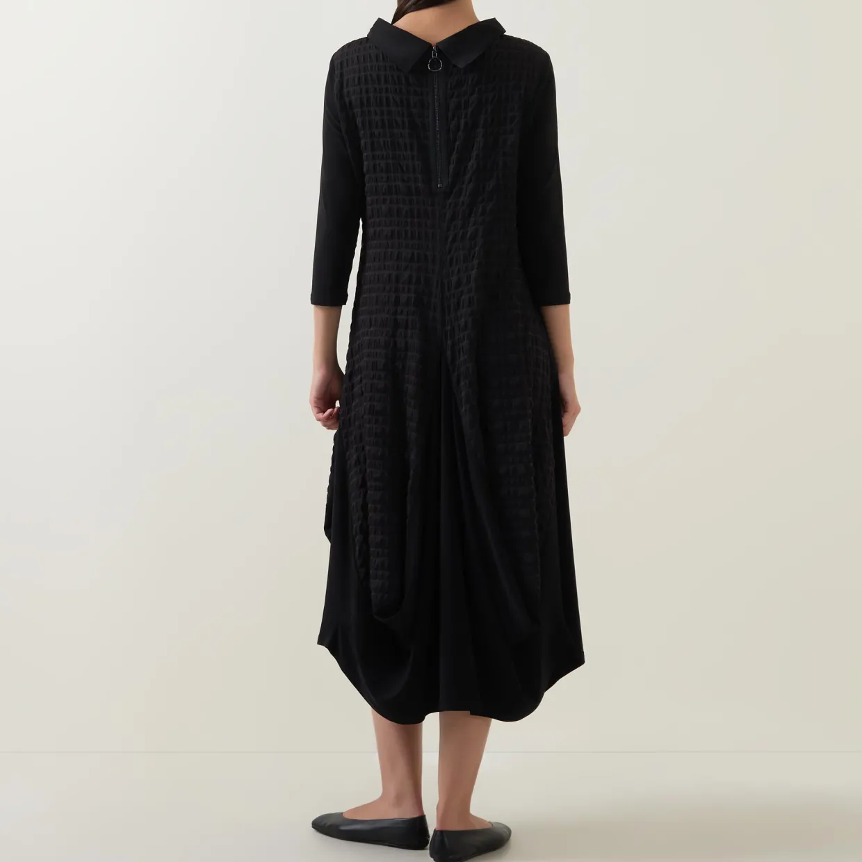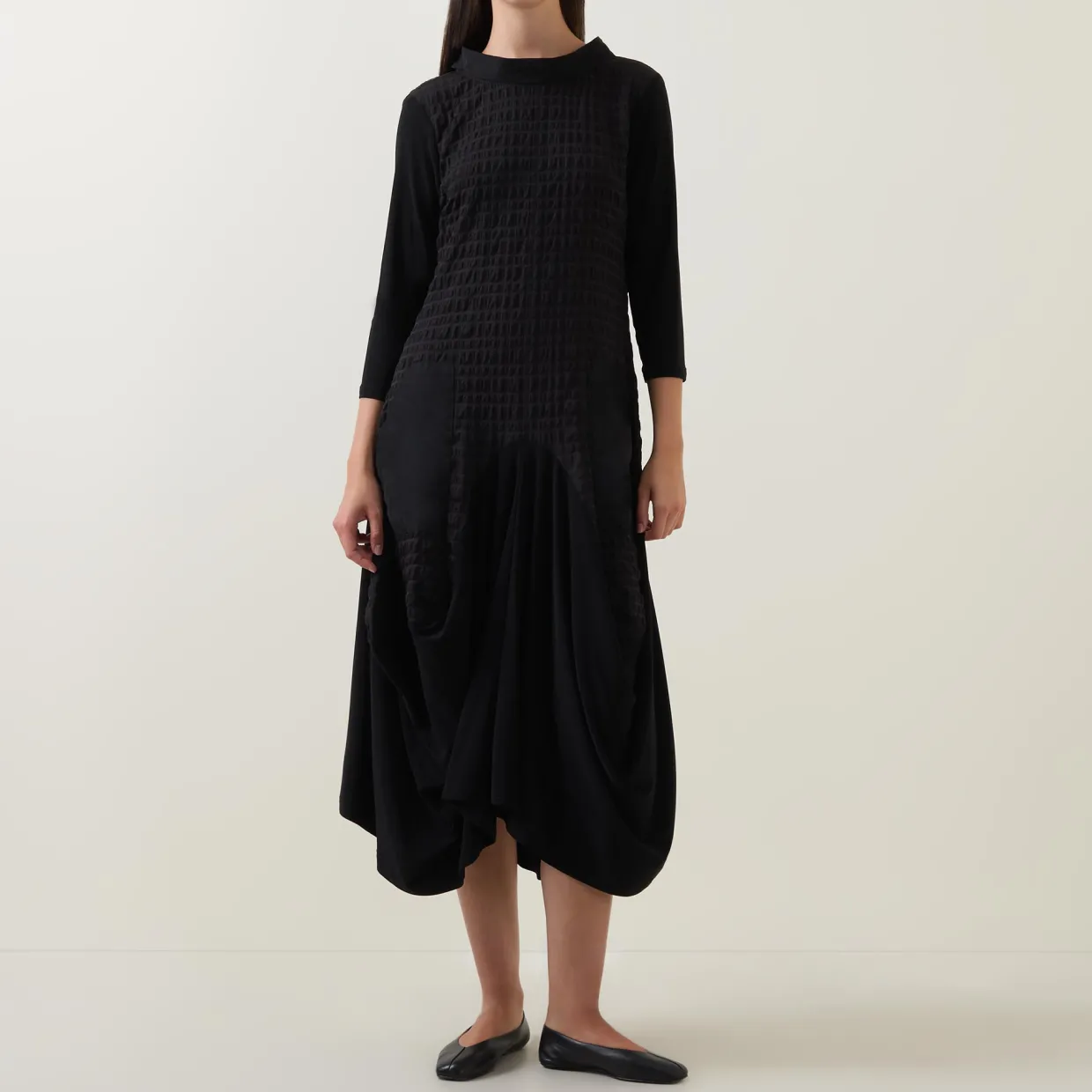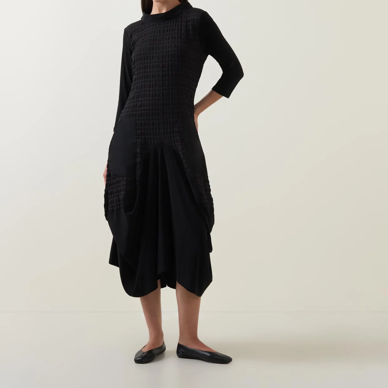 - Cowl neck, three-quarter length sleeves, rear zip fastening, two front pockets, gathered skirt, asymmetric hem, bubble jacquard design, midi length
