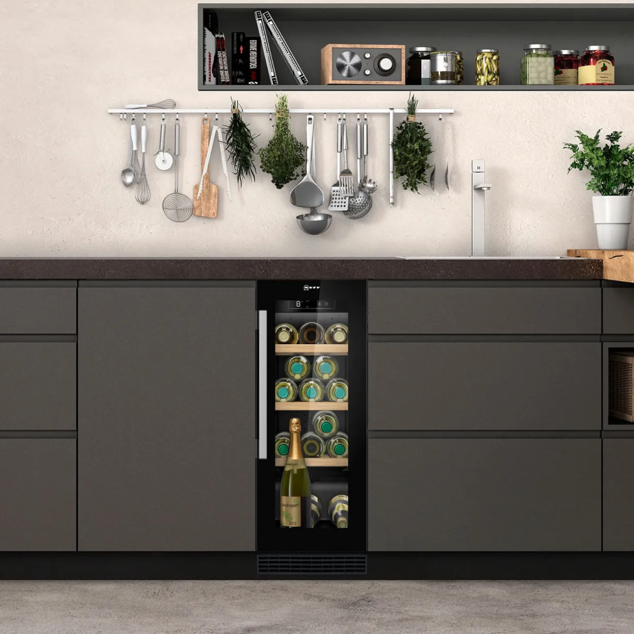 This integrated Neff wine cooler will be a great showpiece for your home. It can hold up to 21 bottles of your favourite brands – you won’t need to nip to the shops for extras in a hurry. And you can adjust the temperature from 5 to 20 degrees to keep your collection in peak condition. Whether a Cabernet Sauvignon, Merlot or Pinot Blanc, every glass will taste delicious. Fancy a night cap? The LED lighting illuminates all the shelves, so you’ll never have trouble picking out a brand. Placing this model where you want is a doddle too, because the door can be adjusted to open from the left or right.