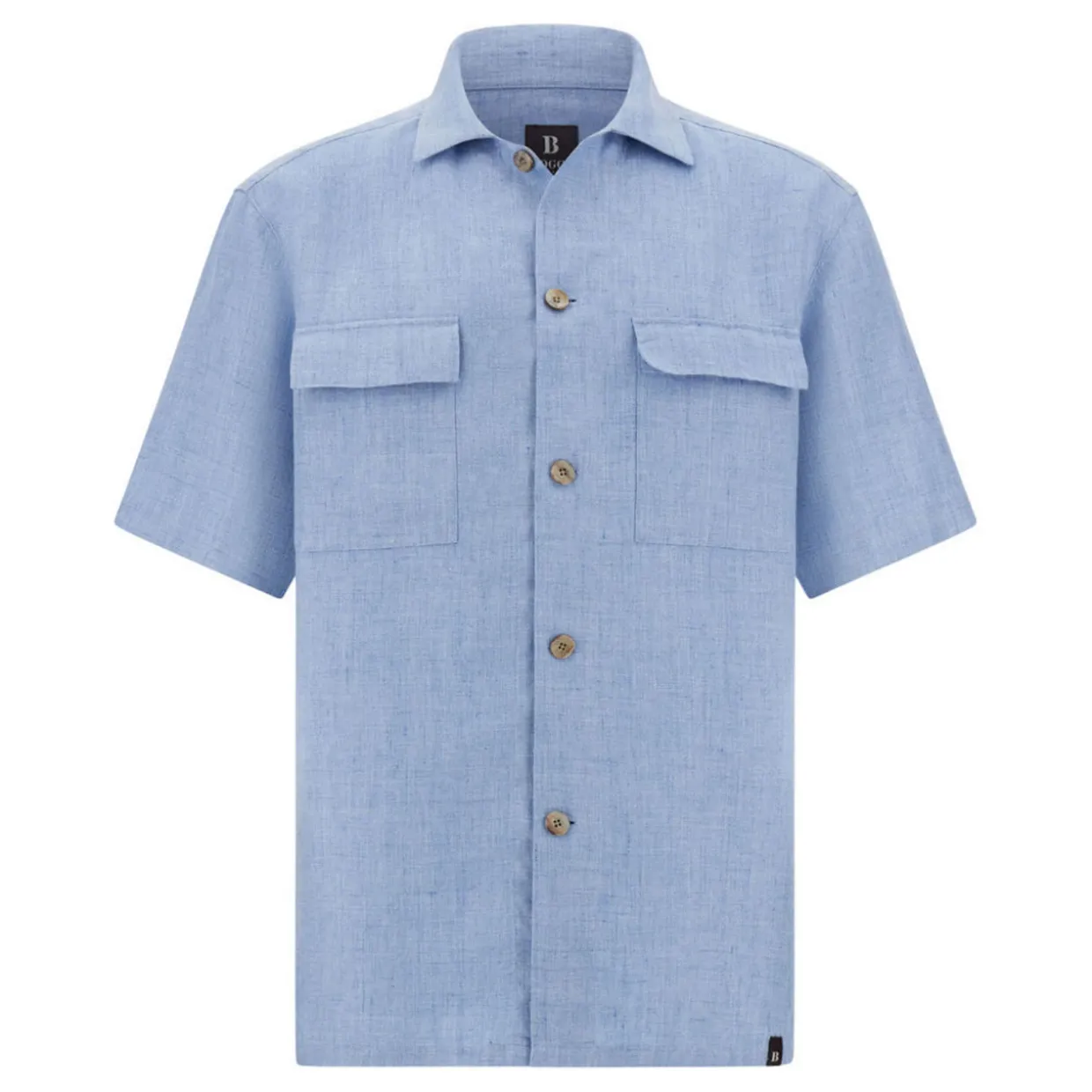 - Point collar, short sleeves, front button fastening, two flap pockets, straight hem
