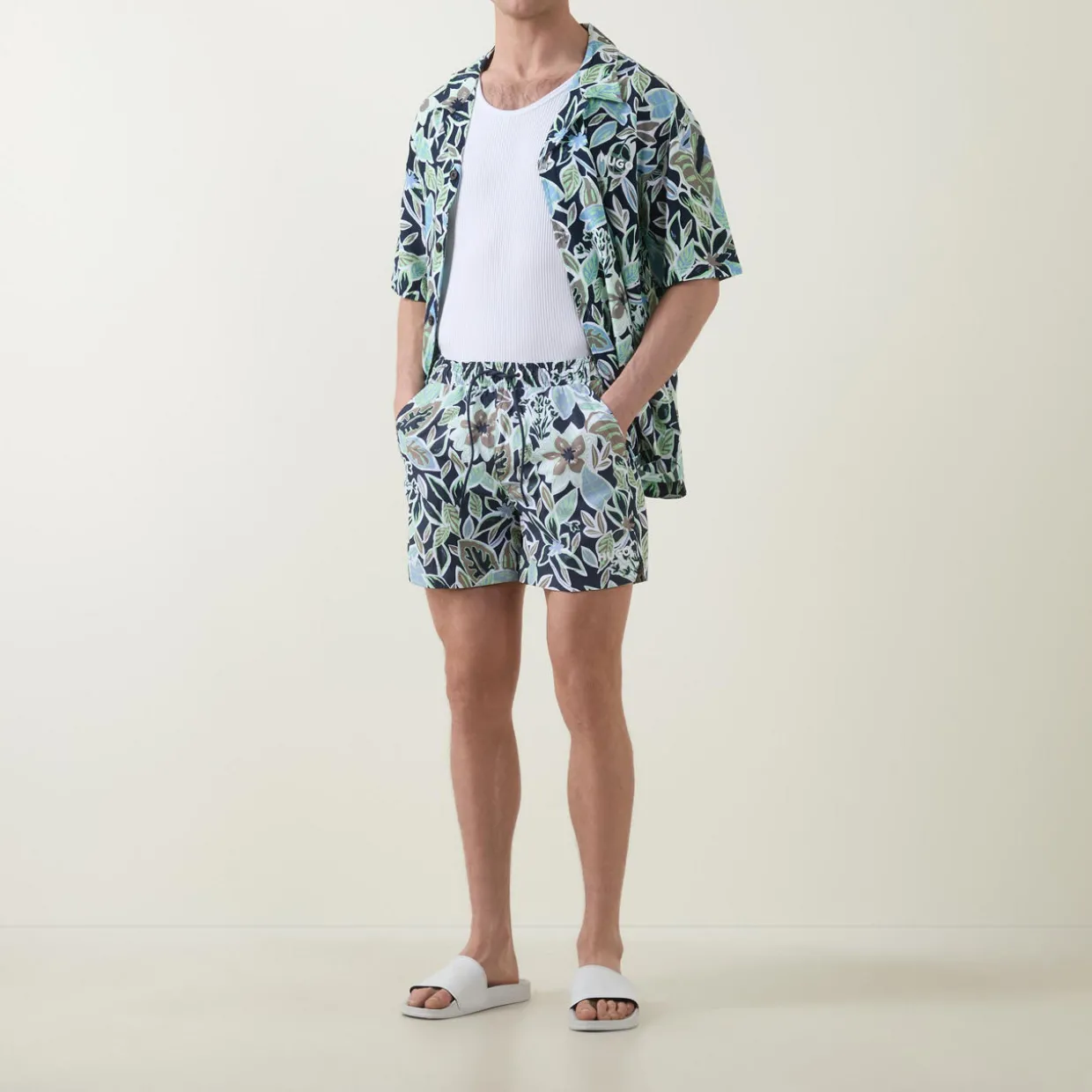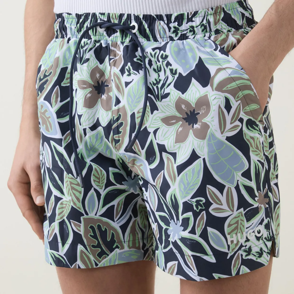 - Elasticated waistband with drawstring tie, floral print, rubberised logo, two side pockets, rear pocket, mesh lining