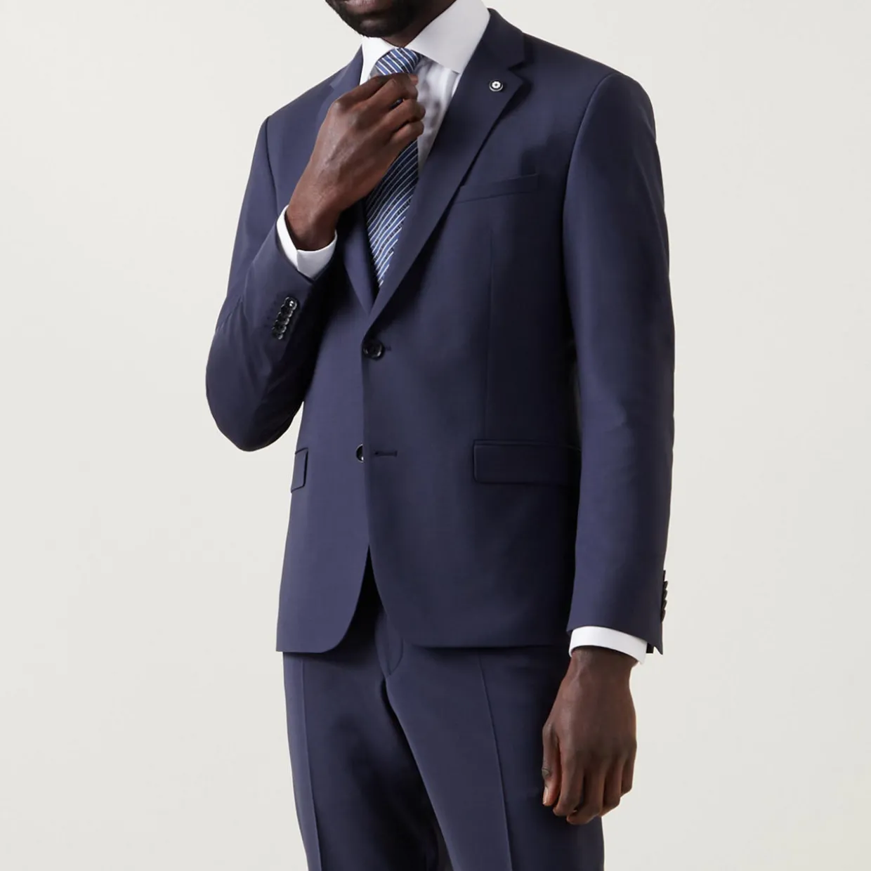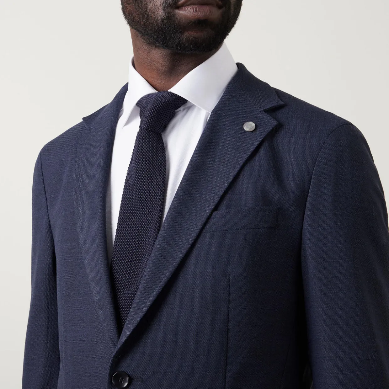 - Long sleeves, single-breasted front, notched lapels, button fastening, chest pocket, two flap pockets, buttoned cuffs, smooth fabric