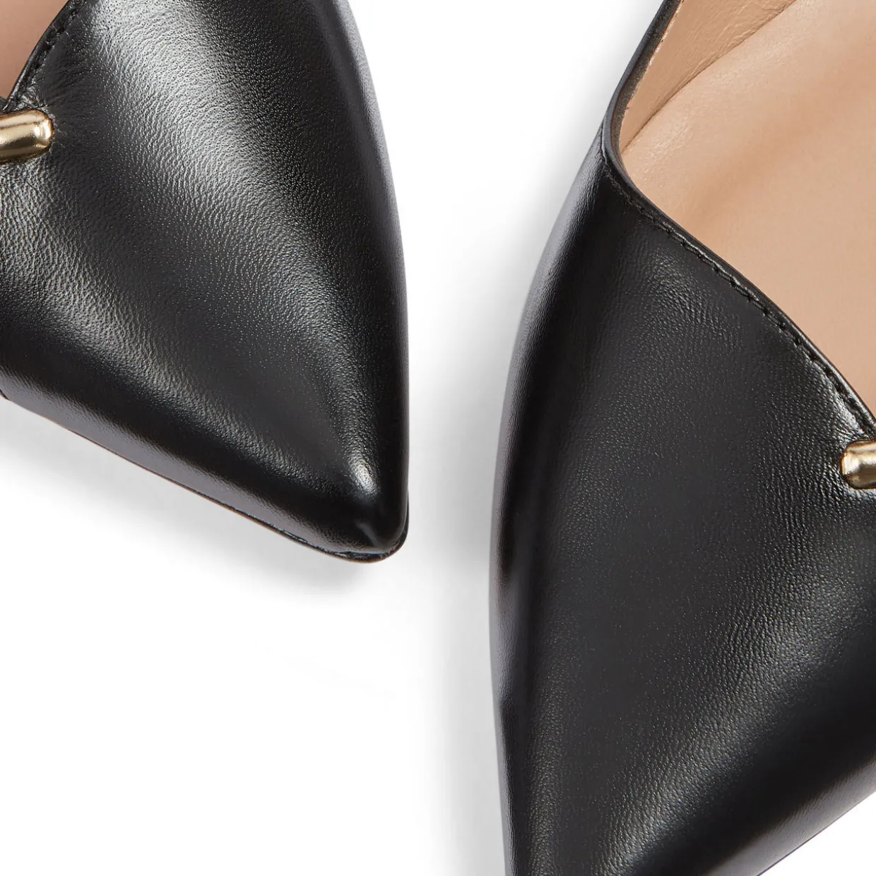 - Nappa leather finish, pointed toe, asymmetric cut, gold-tone nugget detail, flat leather heel, slip-on stop