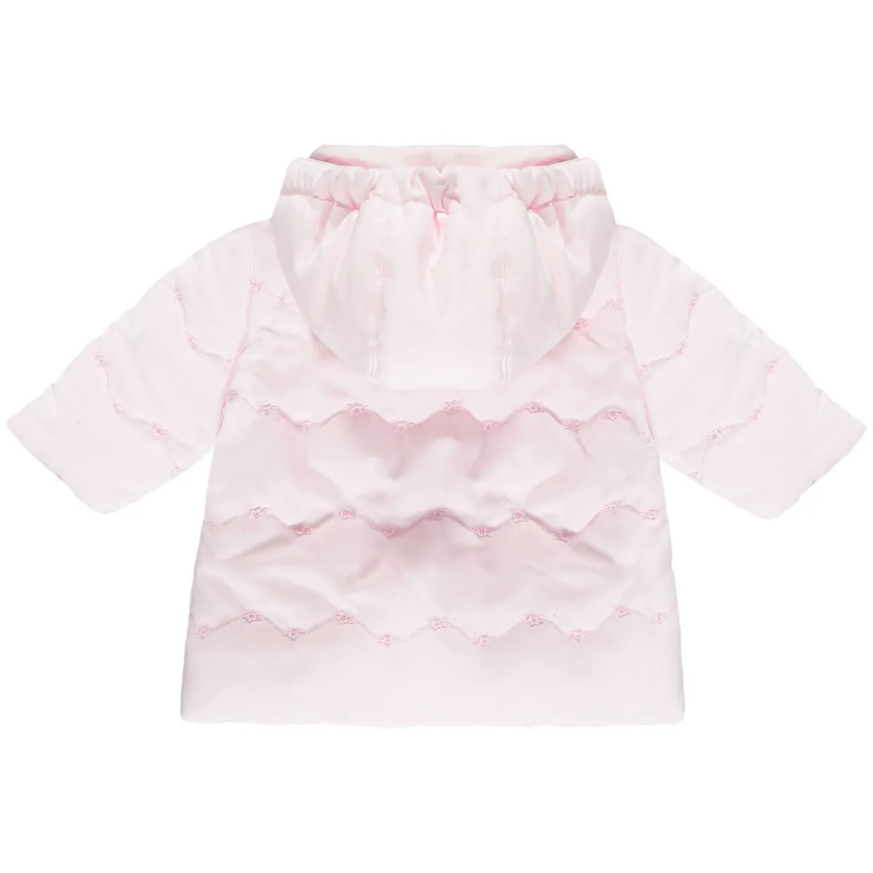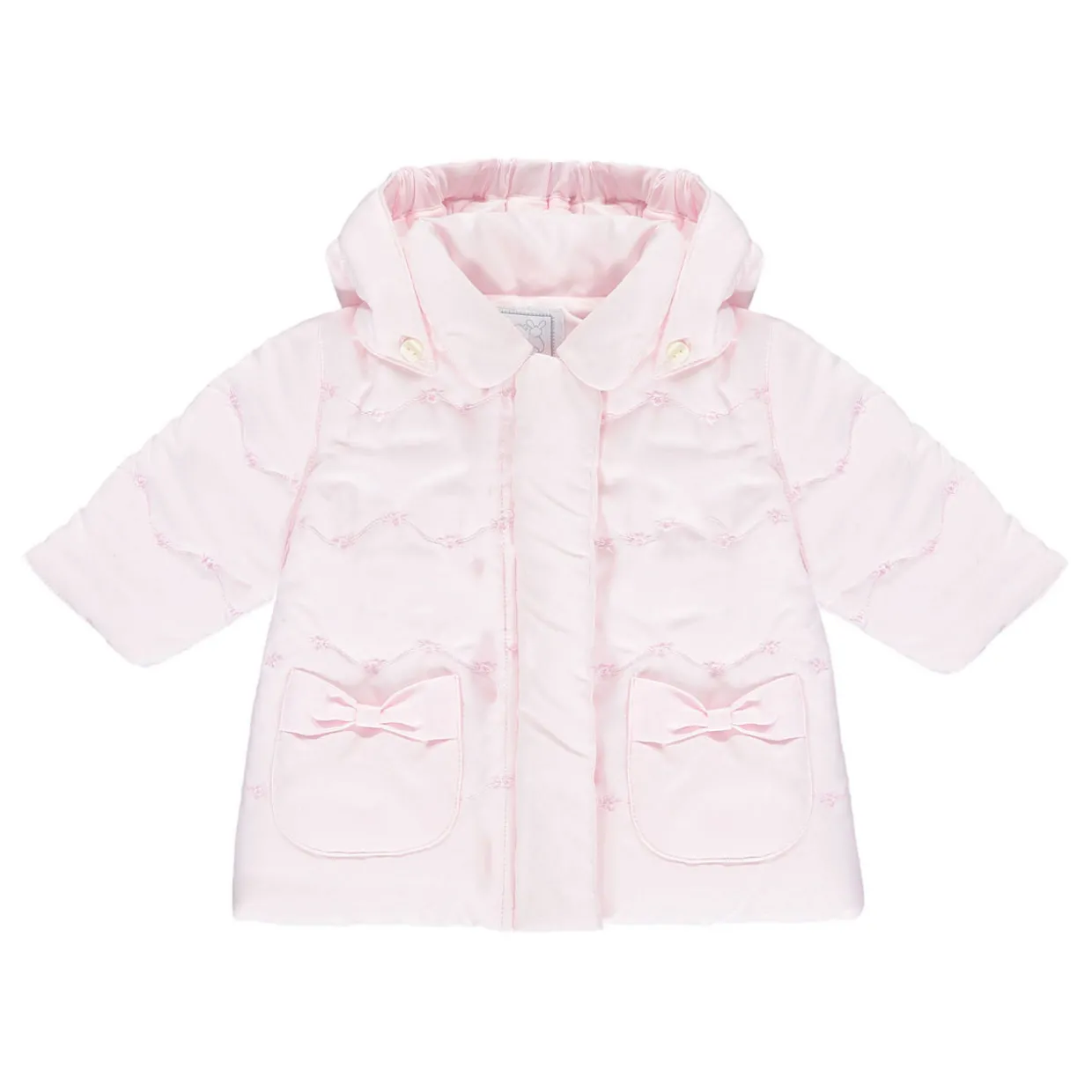 - Long sleeve, hooded, button and zip fastening, bow detail pockets, quilted design.
