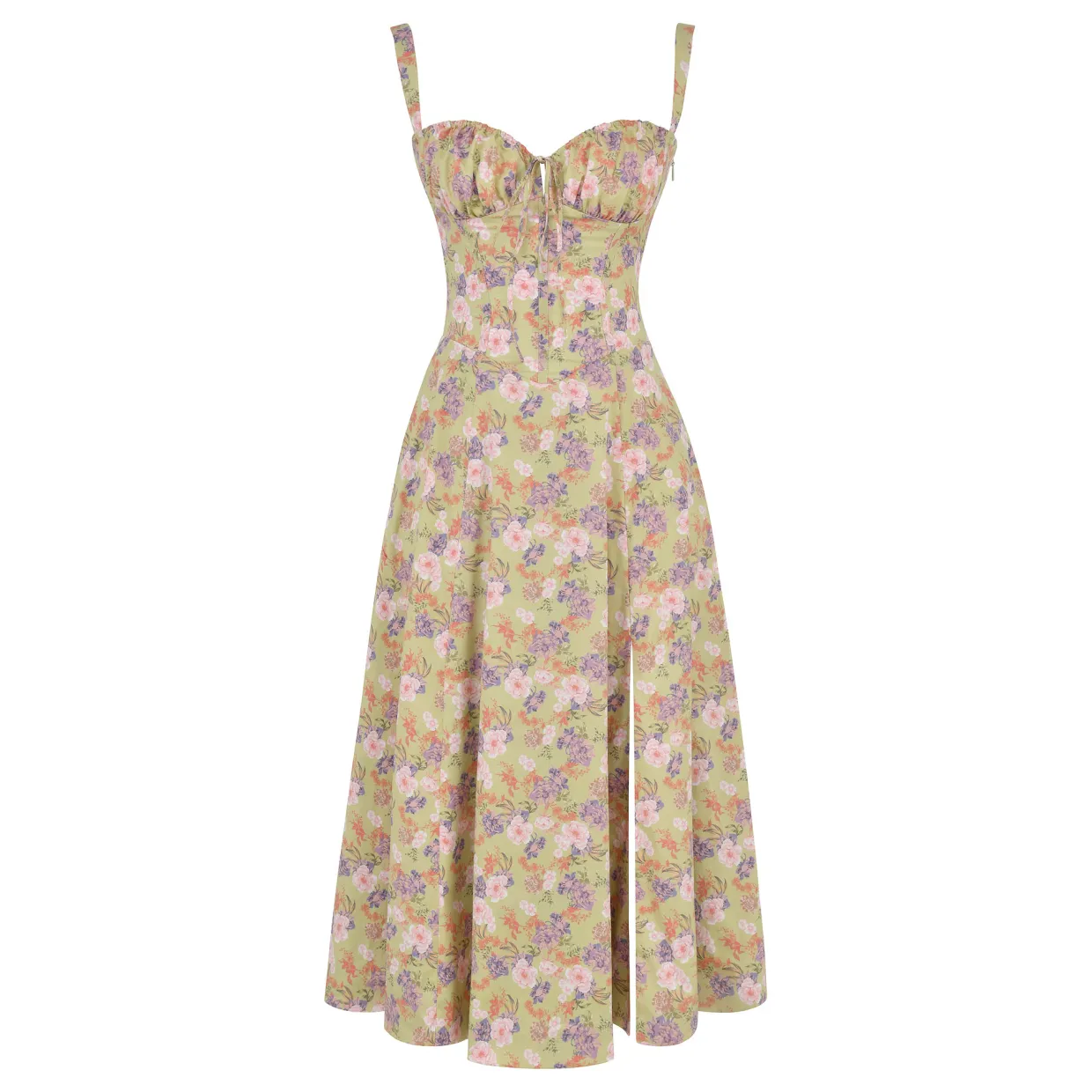 - Stretch cotton, floral print, corseted bodice, lace up back, gathered bust with drawstring tie, side split