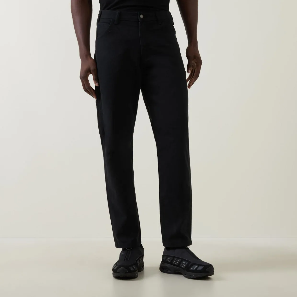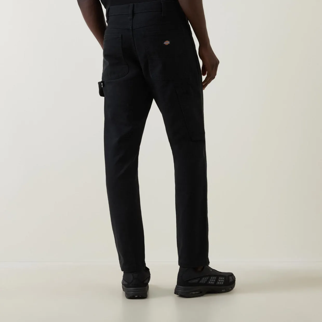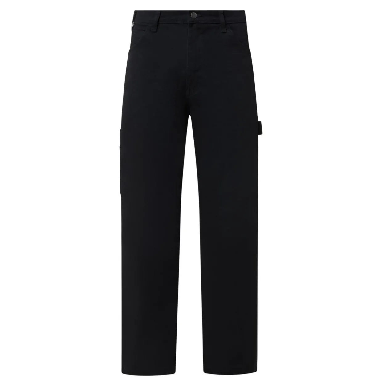 - Mid-rise, straight leg, belt loops, logo patch