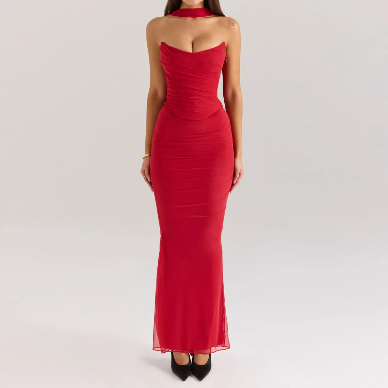 - Maxi length, fluted hem, ruched upper, zip fastening