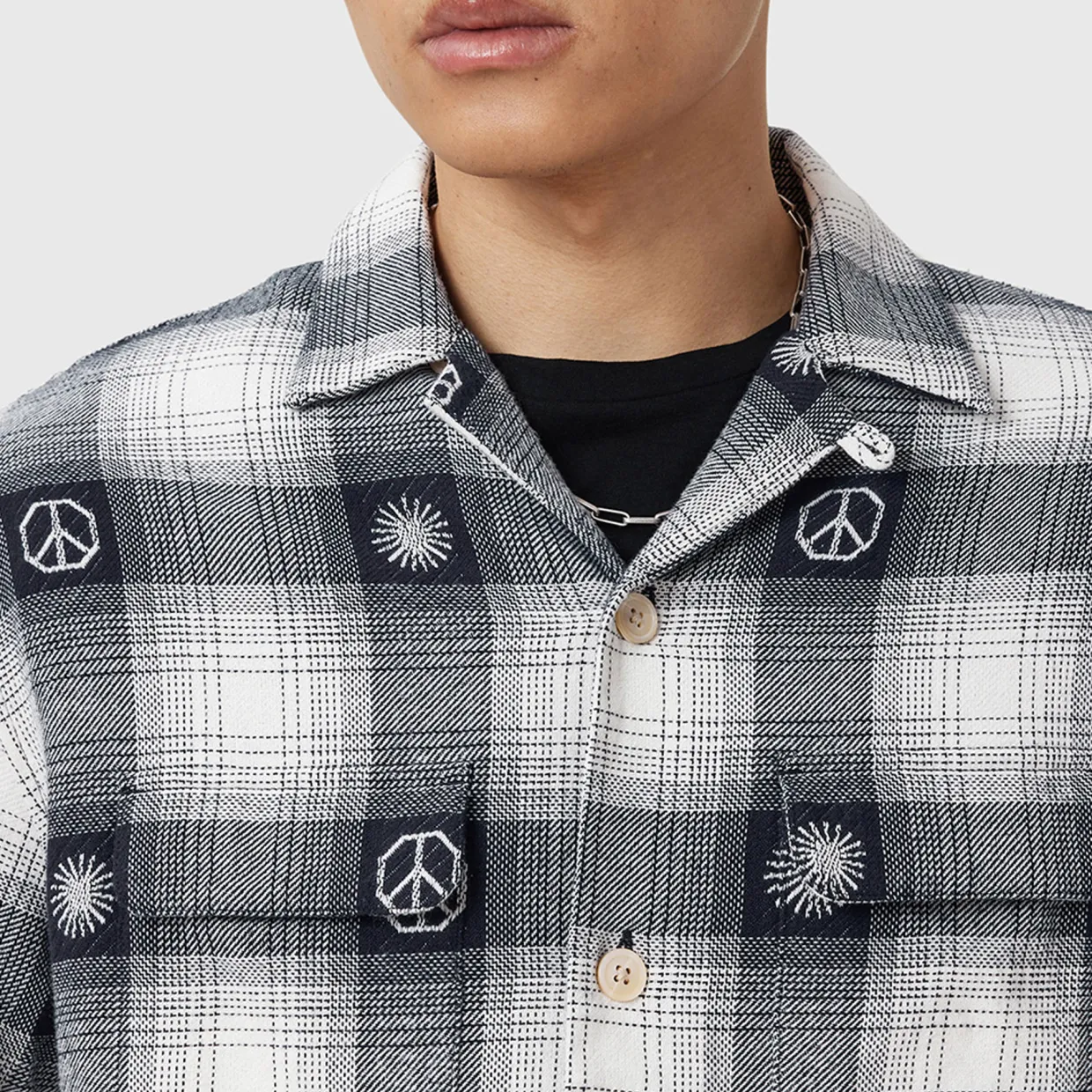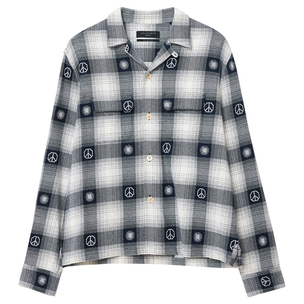 - Hawaiian-style, long sleeve, flap pocket, check print, woven peach and sun design, button closure