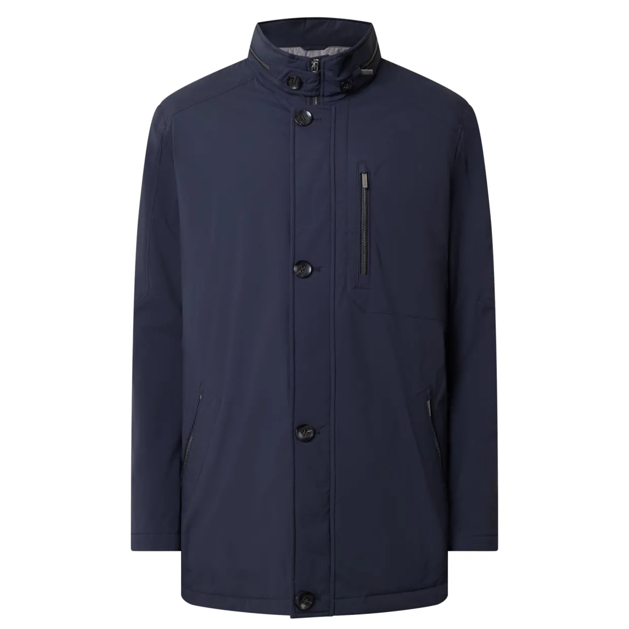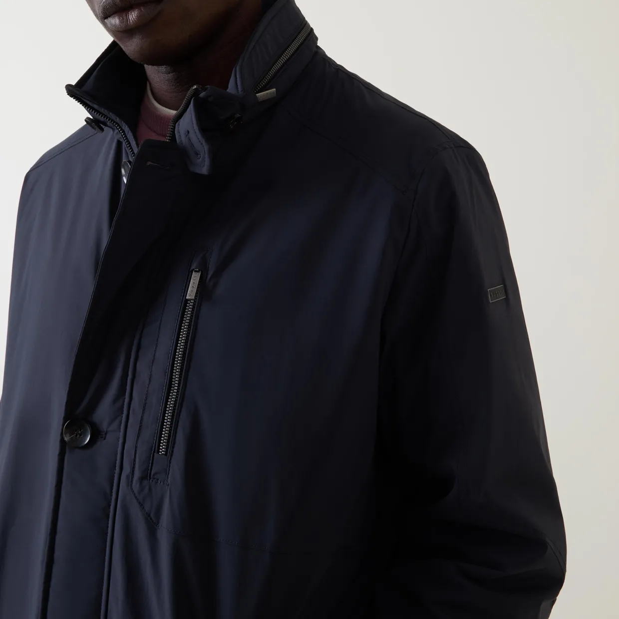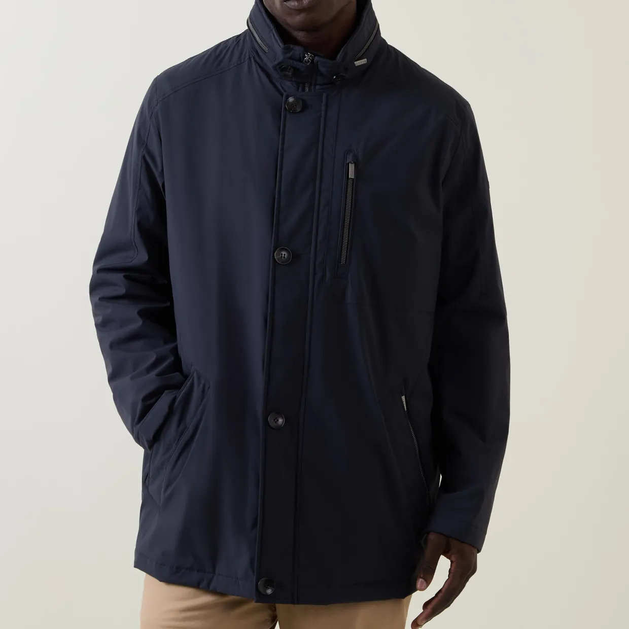- Stand-up collar with zip-fastening stowaway hood, long sleeves, zip-fastening and button placket, zipped chest pocket, two diagonal zip pockets, logo badge on left sleeve, smooth finish