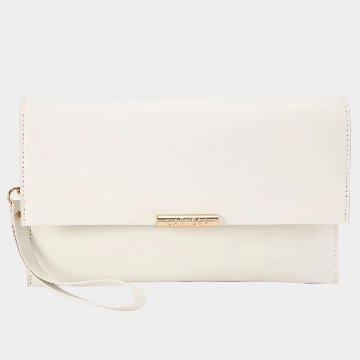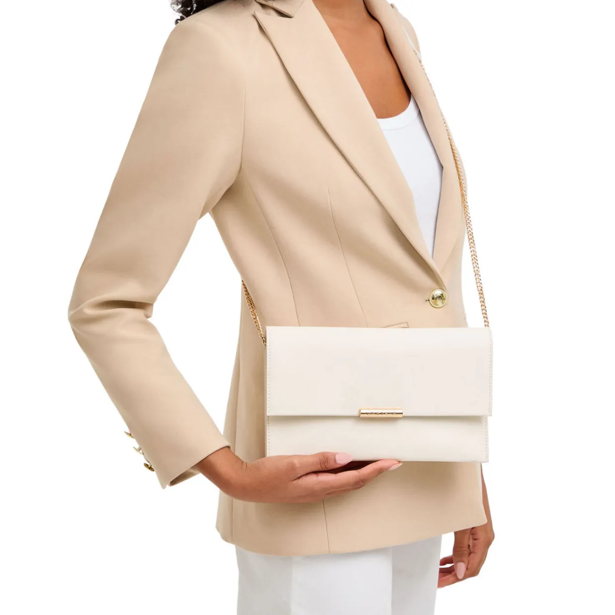 - Flap closure with magnetic snap fastening, detachable crossbody strap, detachable wrist strap, gold-tone hardware, logo detail, smooth finish