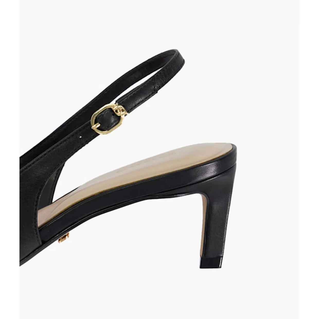 - Pointed toe, stiletto heel, slingback silhouette, branded buckle fastening, gold-tone hardware, smooth leather finish