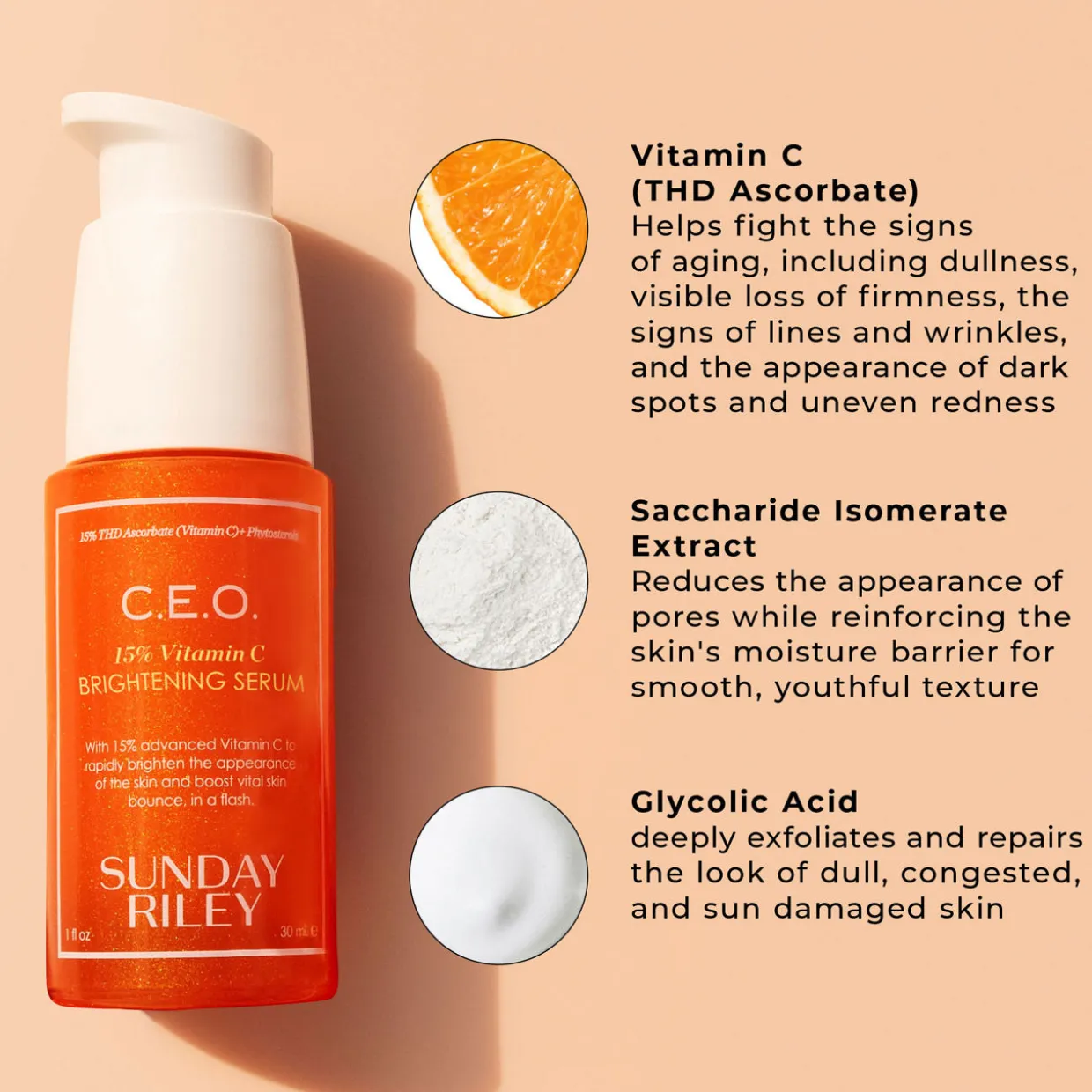 - C.E.O. Brightening Serum uses a sophisticated, ultra-powerful form of Vitamin C called THD Ascorbate. Both highly stable and oil-soluble, THD Ascorbate rapidly absorbs into the skin for visible anti-aging benefits, including visual improvement in loss of firmness, the appearance of lines and wrinkles, and dark spots and dullness.