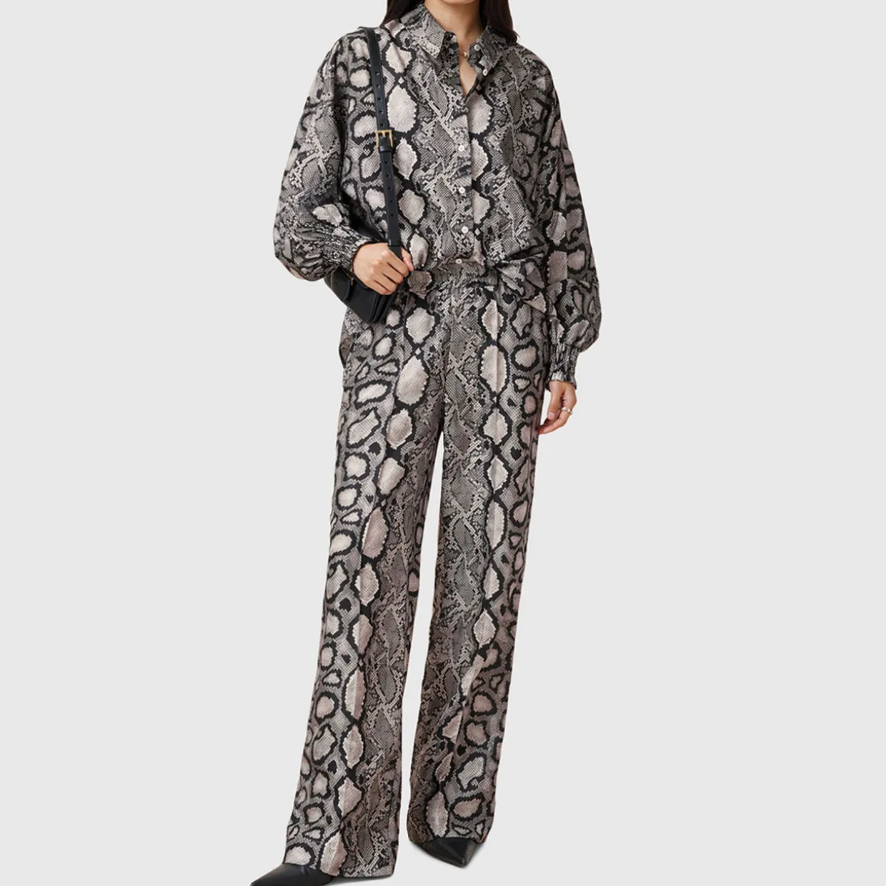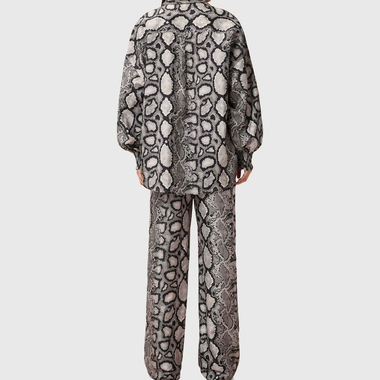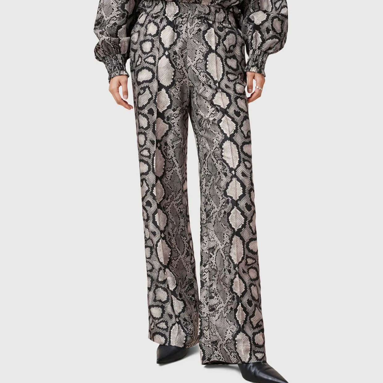 - High rise, wide leg, elasticated waist, snake print, side pockets