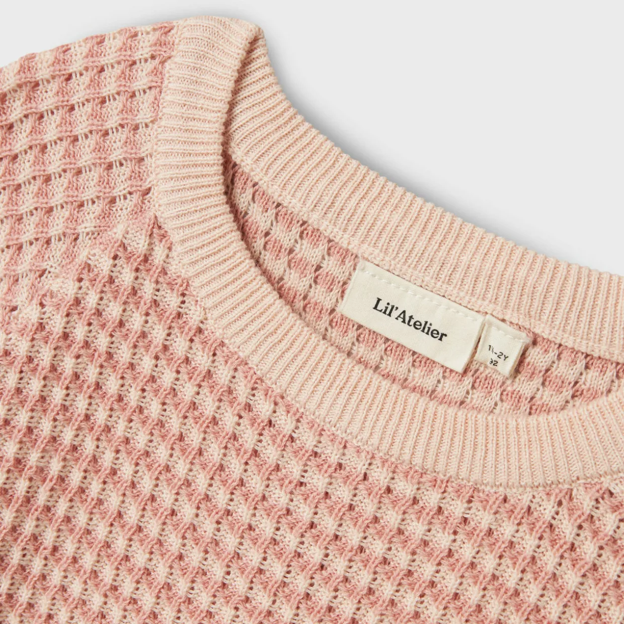 - Crew neckline, short sleeves, ribbed trims, check pattern, pullover style, knitted finish