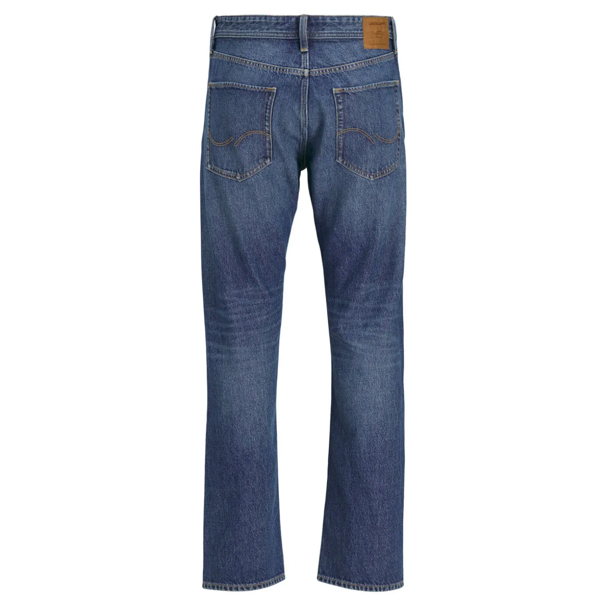 - Zip-fly and button fastening, belt loops, five-pocket design, contrast stitching, rear logo patch, whiskering and faded detailing, mid-rise, straight-cut leg, smooth denim finish