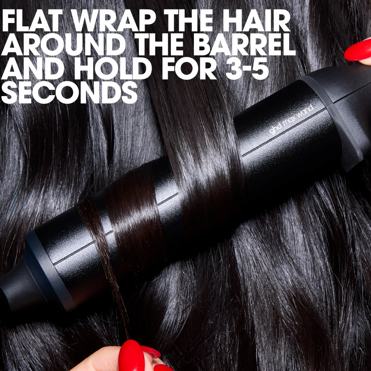 - Place wand parallel to the section nose pointing down and flat wrap hair around the barrel twice.