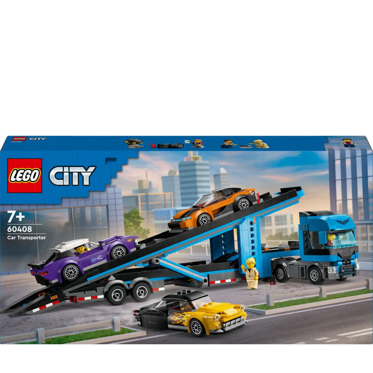 - 998 pieces, double-decker transporter toy truck with trailer, ’50s-style tail dragger car, ’70s-style muscle car, modern electric car model, 4 minifigures, vehicle accessories, toy medic kit, fire extinguisher
