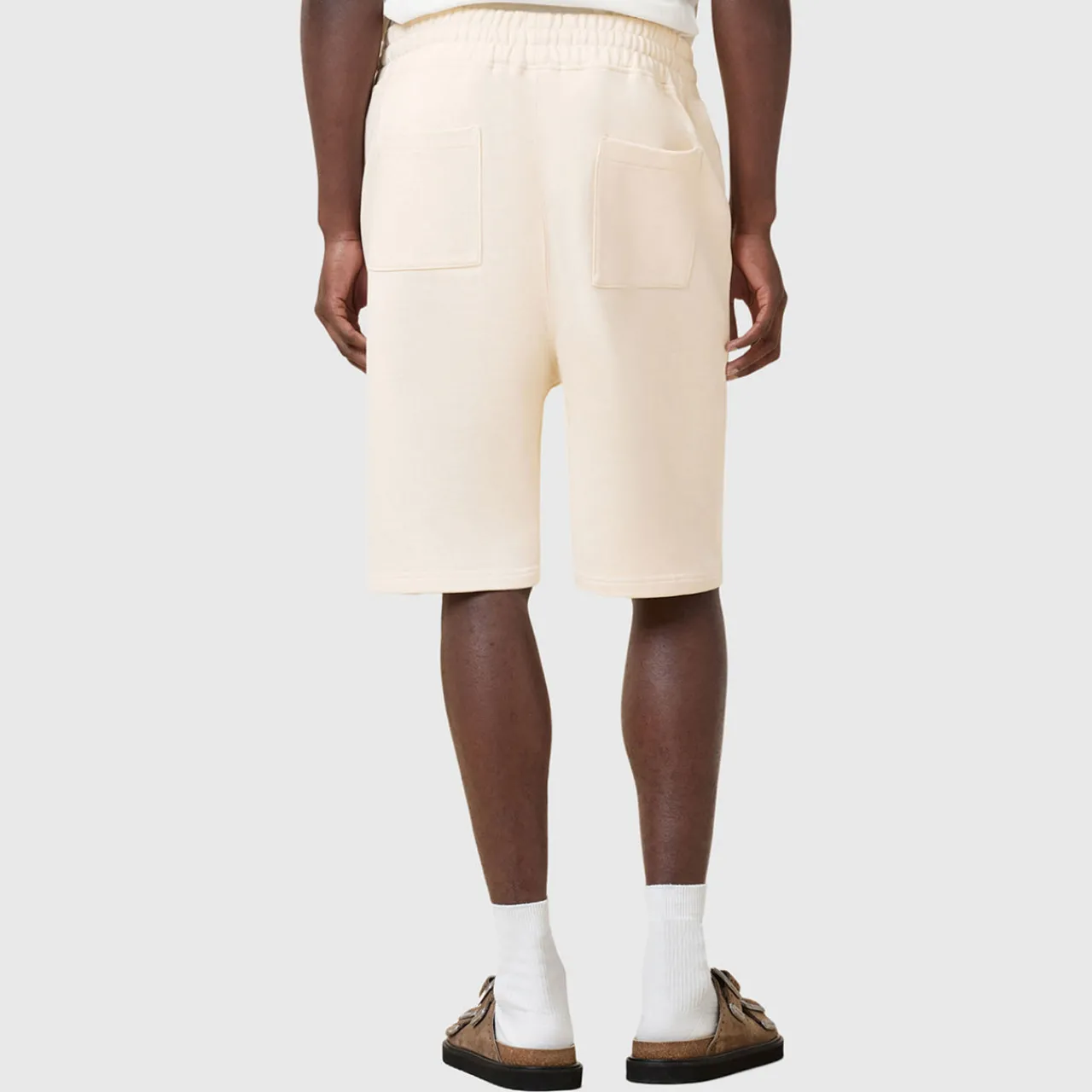 - Self fabric elasticated waistband, drawcords, front pockets, two back pockets, stitched hem, pull-on style