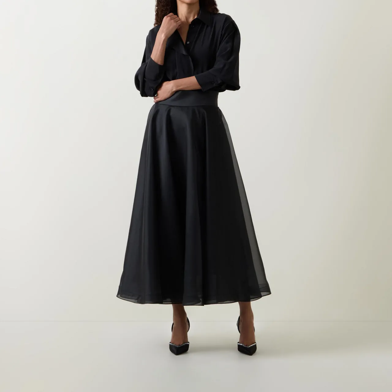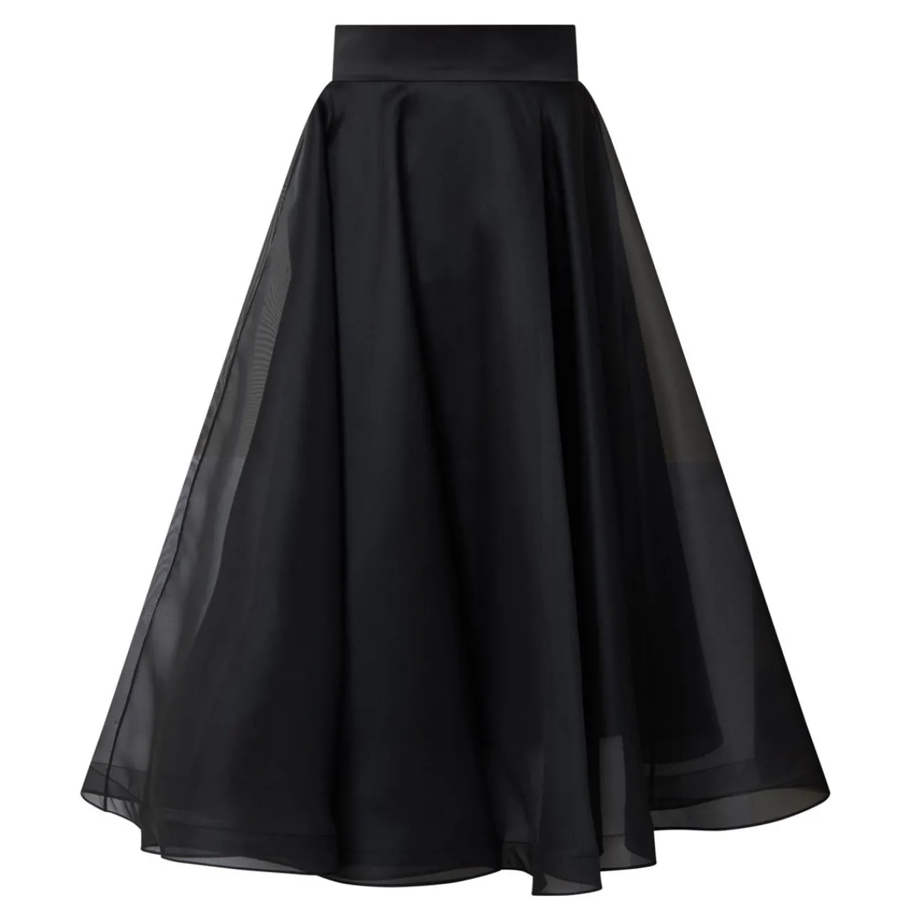 - High-rise, wide waistband, back zip-fastening closure, organza layer, pleated flared silhouette, midi length