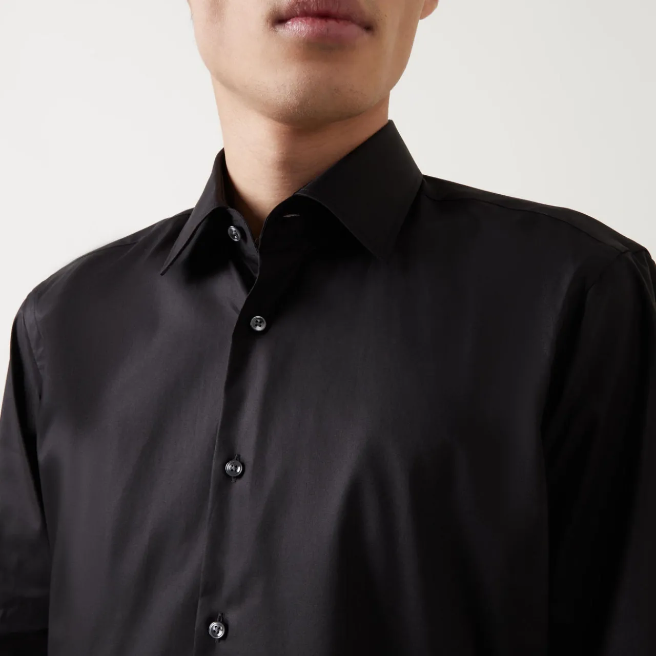 - Pointed collar, button fastenings, long sleeves, curved hem