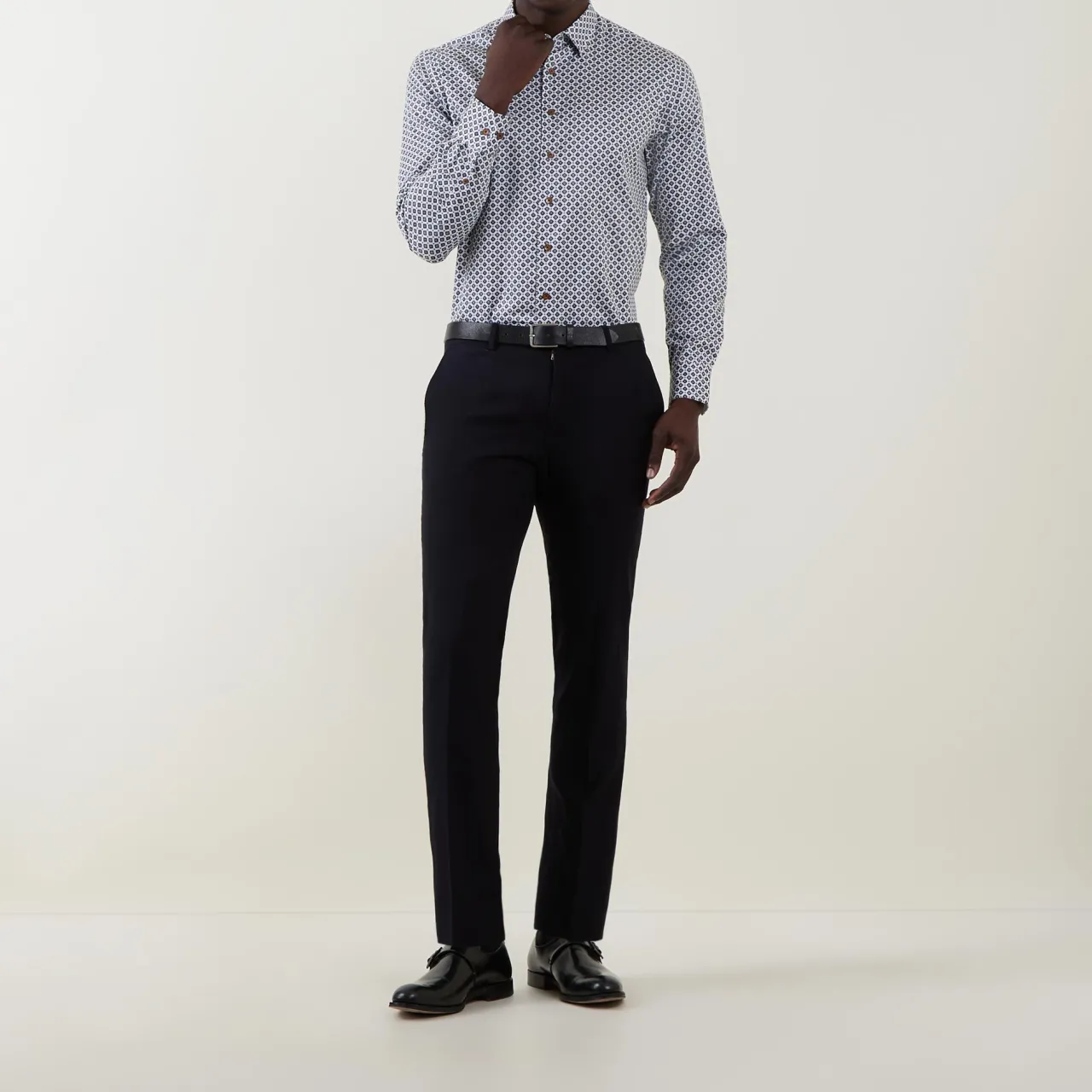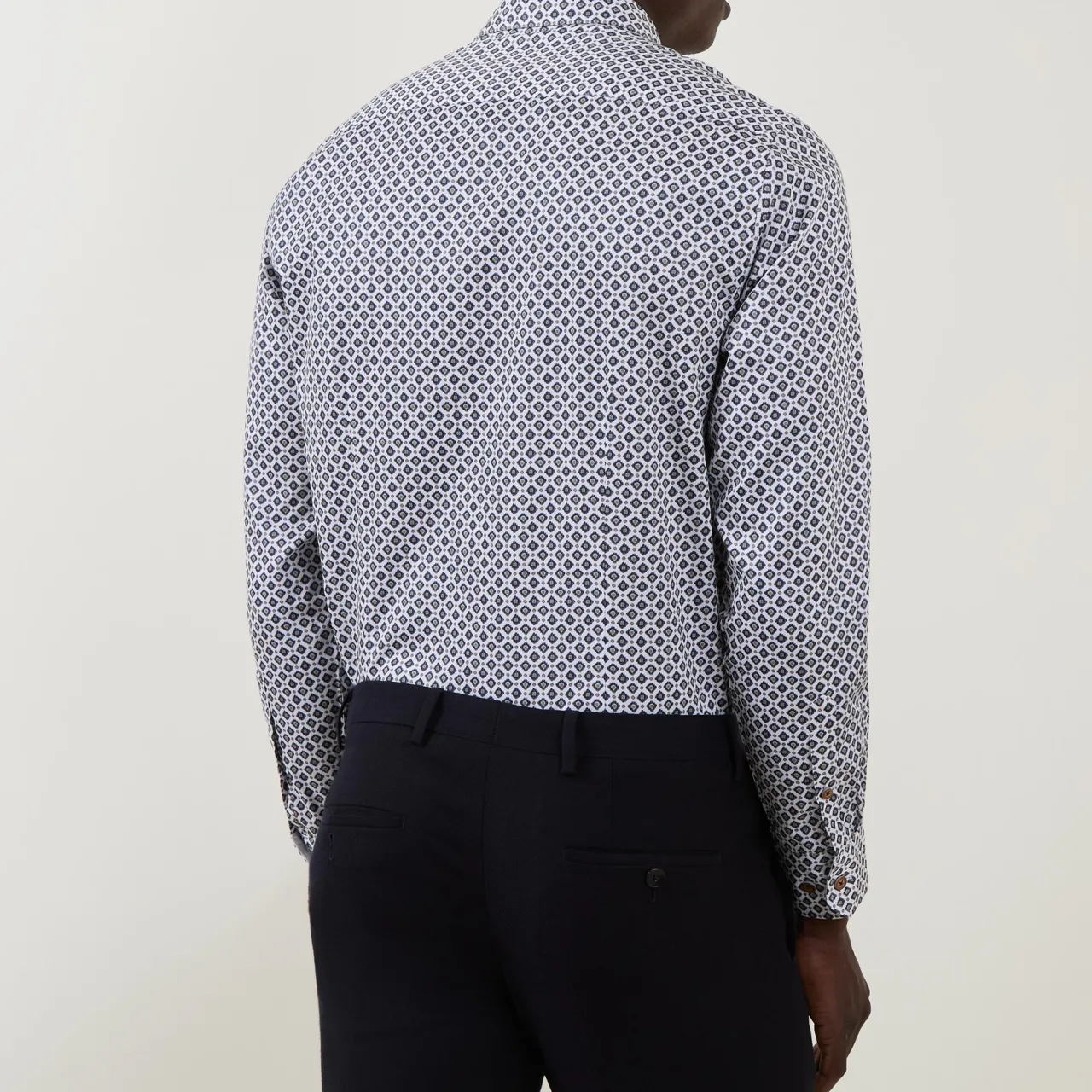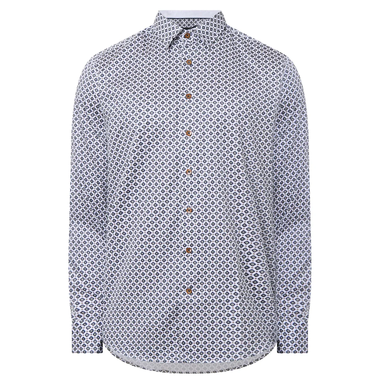 - Button-down collar, long sleeves, geometric pattern, button fastenings, curved hemline