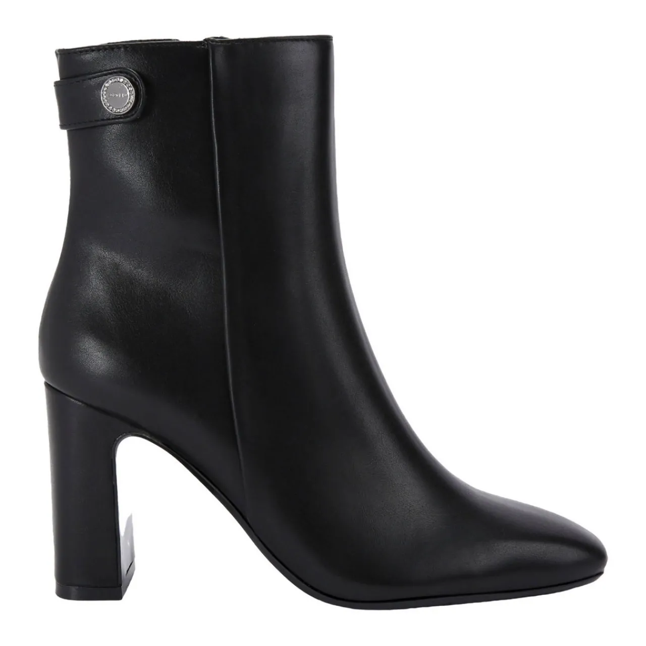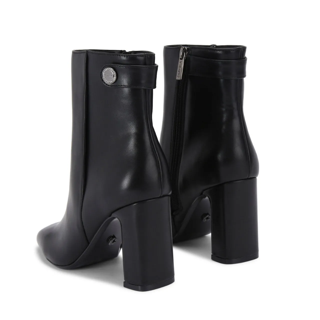 - Back ankle strap, gunmetal round stud with crystal embellishment, block heel, smooth finish, inside zip fastening, soft squared toe, All Day Long technology