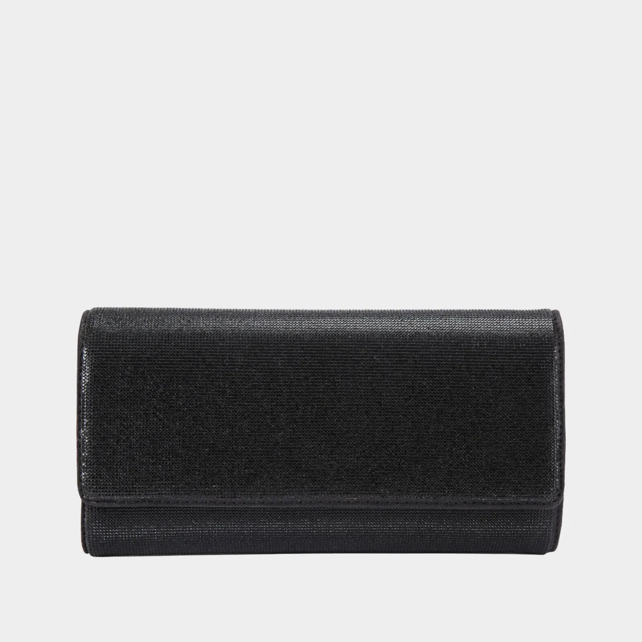 - Clutch silhouette, fabric design, chain strap, crystal embellishment, gold branding