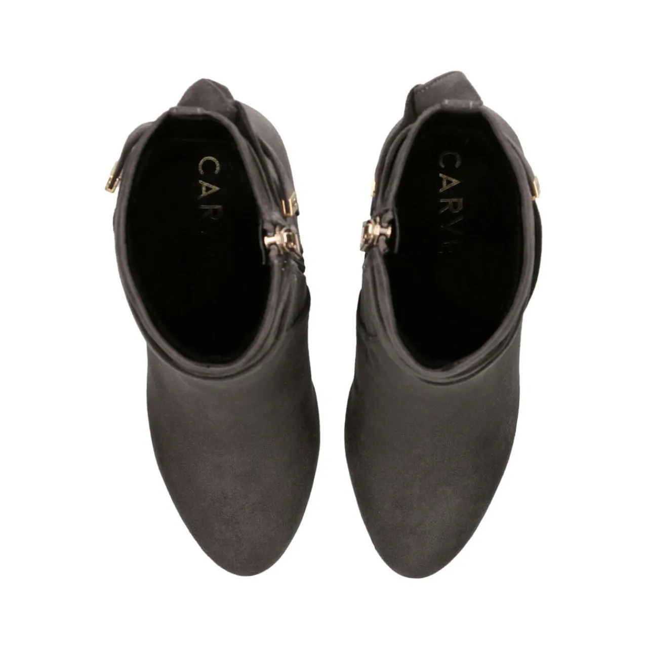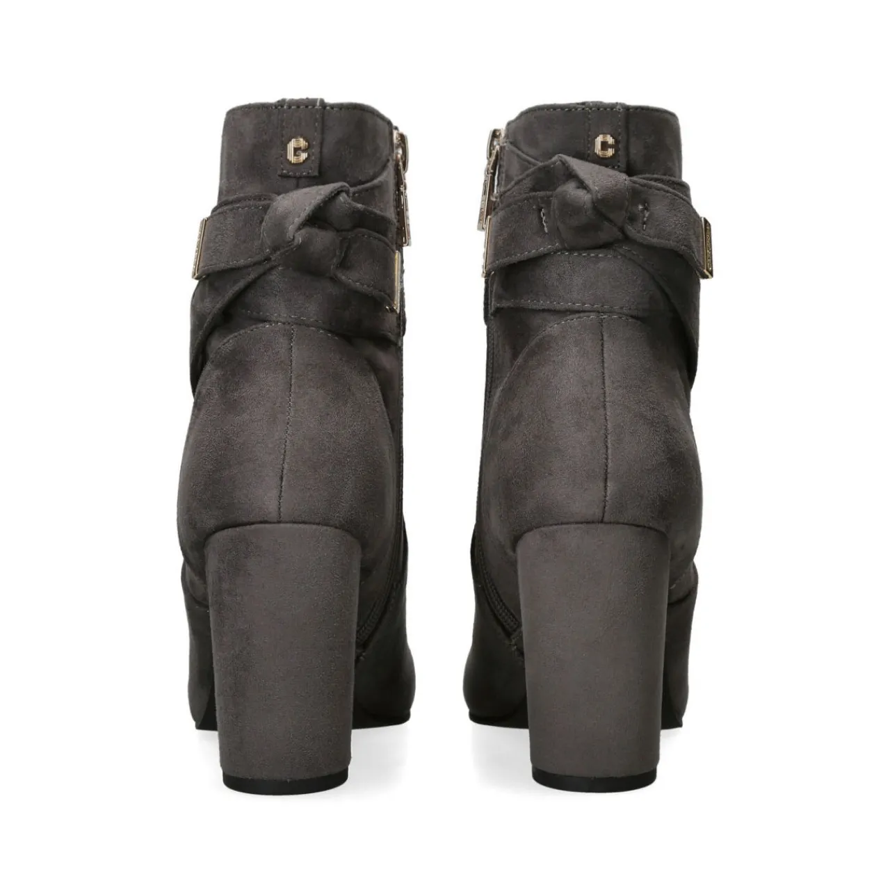 - Microsuede upper, bow detail at the back of the ankle, gold-tone branding, zip on the inner side of the ankle, pointed toe, block heel, ankle length