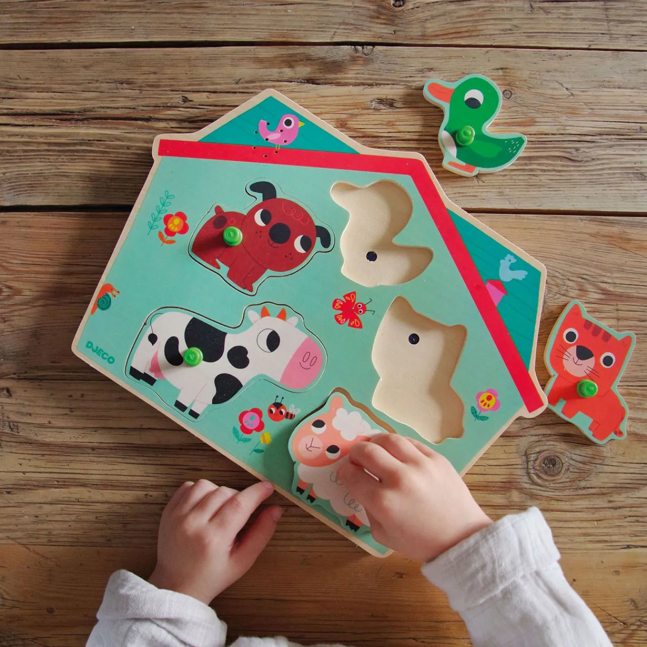 - Wooden sound puzzle with 5 pieces. 2 AAA batteries included