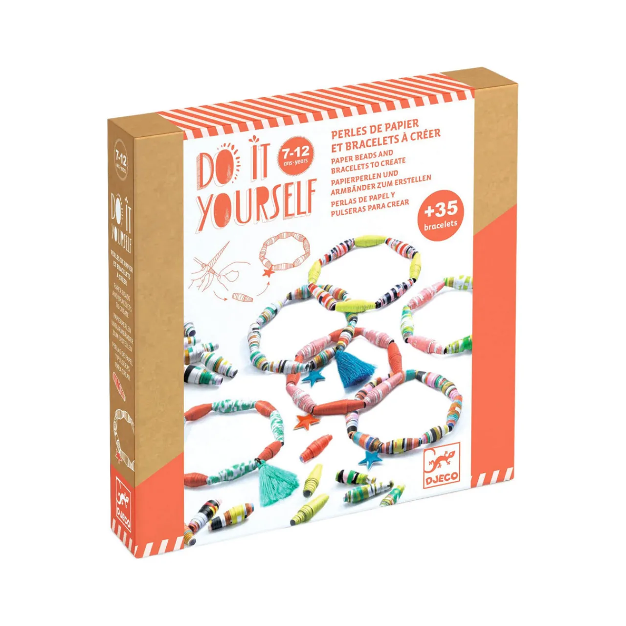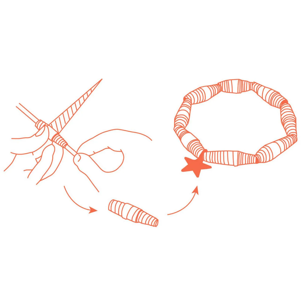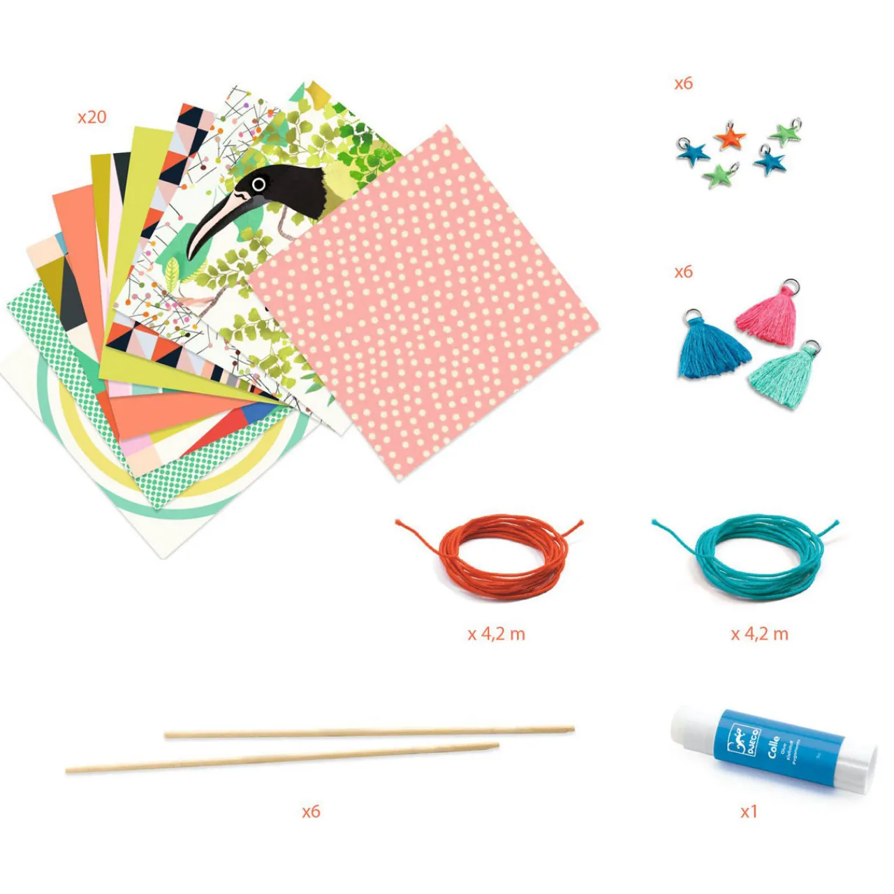 - 20sheets of patterned paper, 6wooden sticks, 6elastic cords (3blue and 3pink), 6star-shaped pendants, 6pompoms, 1glue stick, 1colour step-by-step instructions booklet