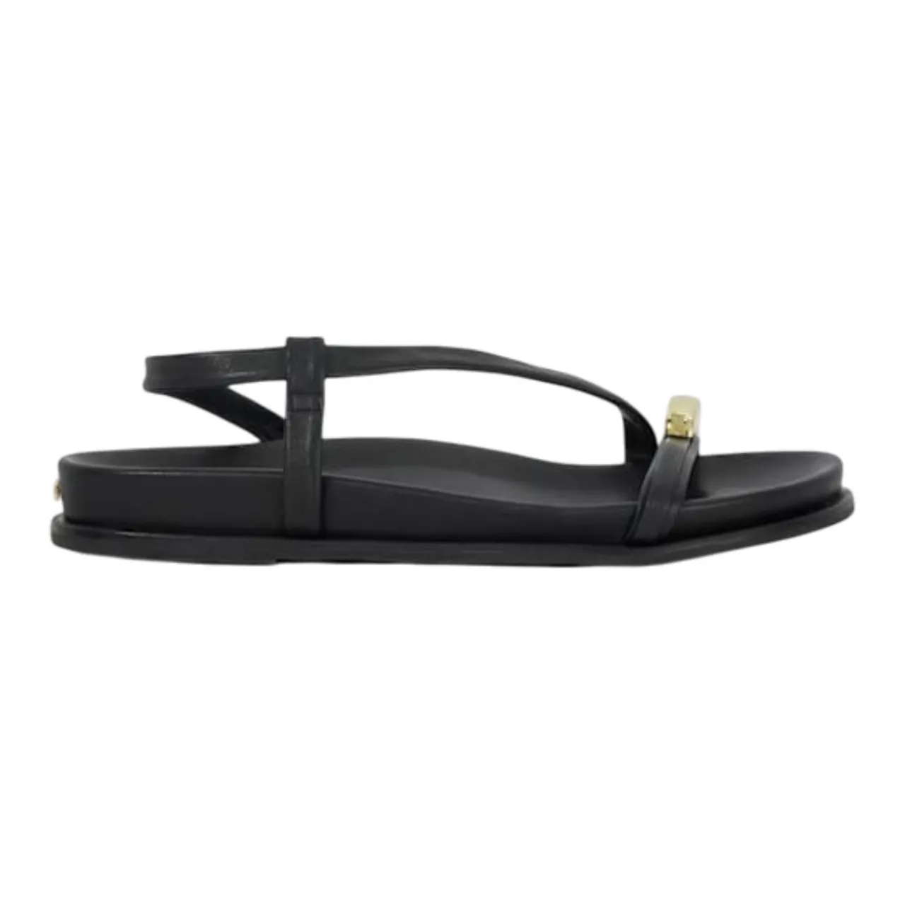 - Asymmetric design, gold-tone toe trim, supportive footbed, flexible rubber sole