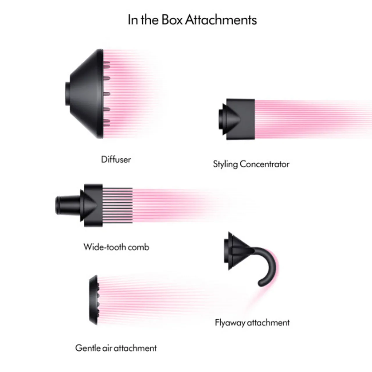 The Dyson Supersonic™ hair dryer comes with five magnetic styling attachments. For easy fitting and rotation during styling.