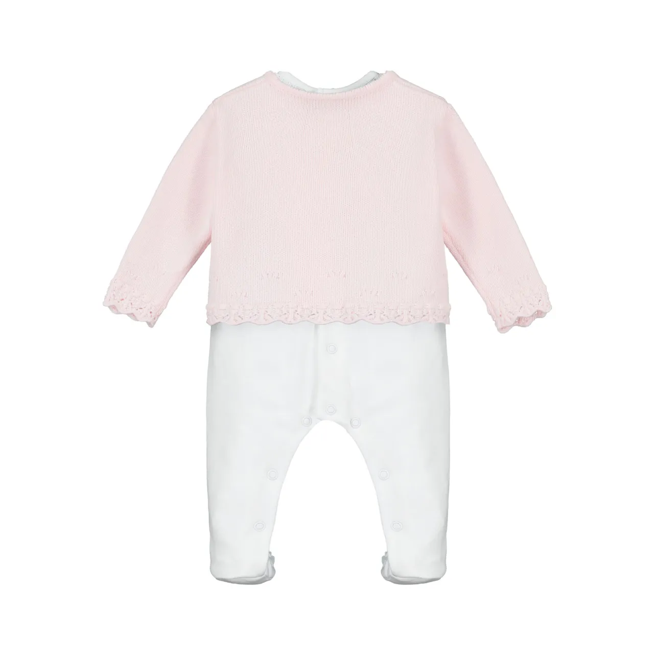 - Babygrow: Lace trim on neckline and ankles, rosebud embroidery details, snap button fastenings. Cardigan: Knitted, scalloped edge, bow details, button fastenings