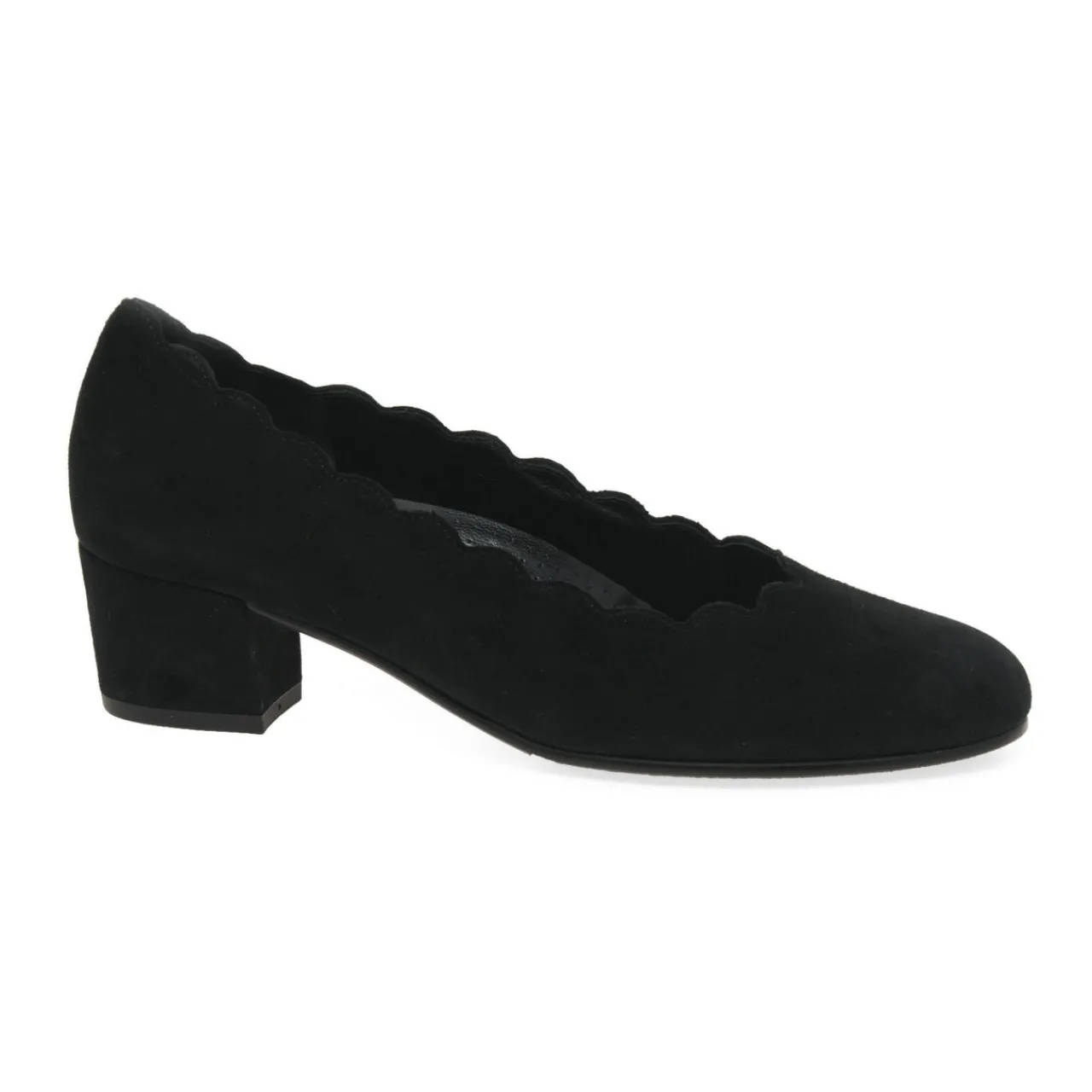 - Round toe, low vamp, slip-on style, block heel, scalloped trims