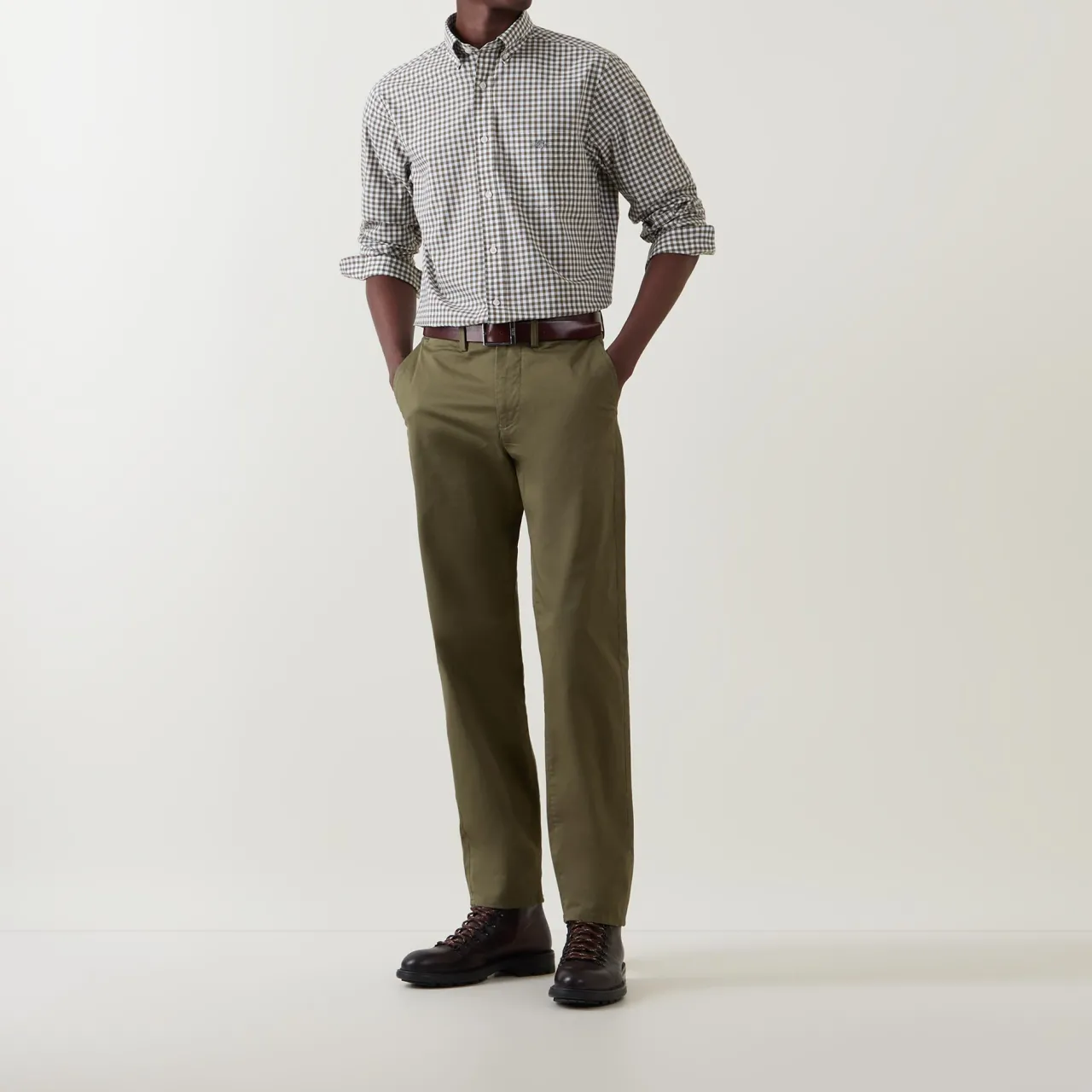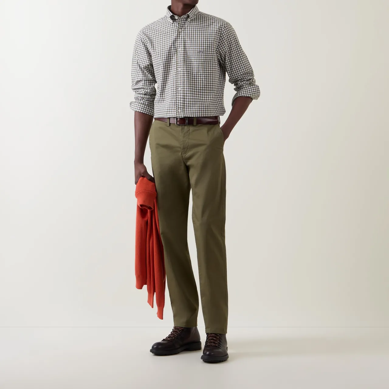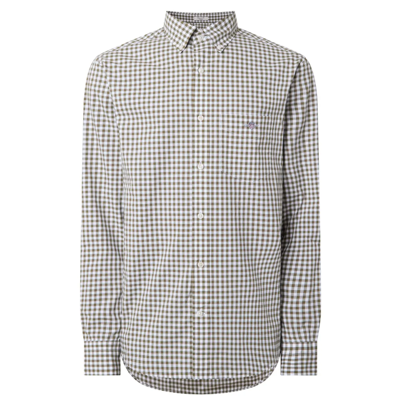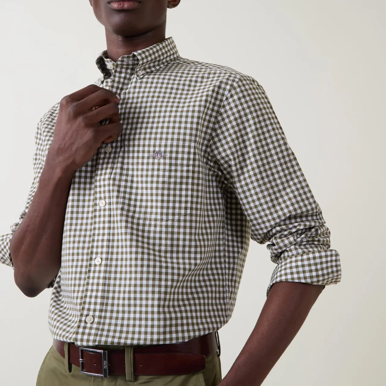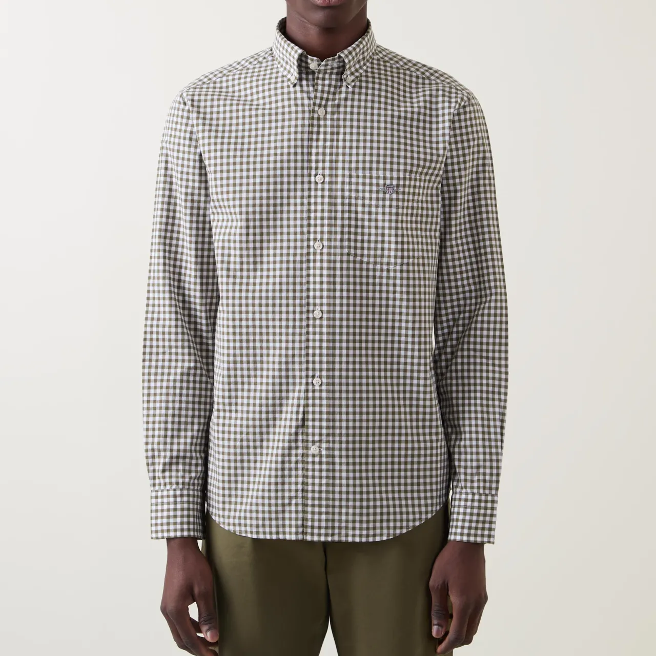 - Button-down collar, button placket, one chest pocket, gingham pattern, poplin fabrication, curved hem, buttoned cuffs, logo detail to chest