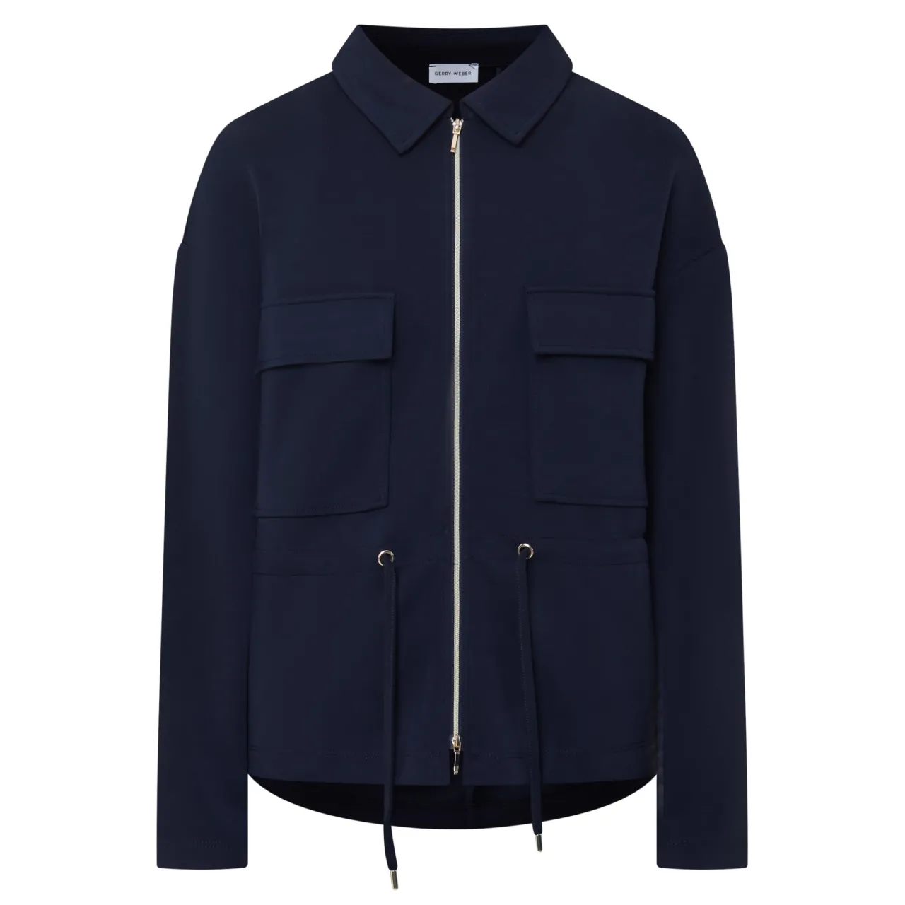 - Point collar, long sleeves, full zip-through fastening, two chest flap pockets, adjustable drawstring waistline, two side in-seam pockets, pressed creases, smooth fabric