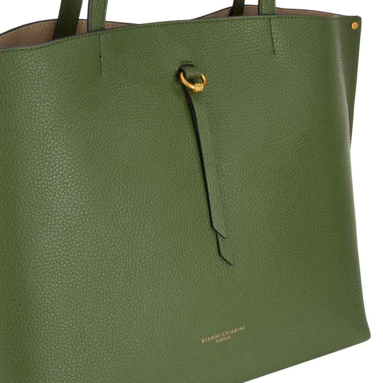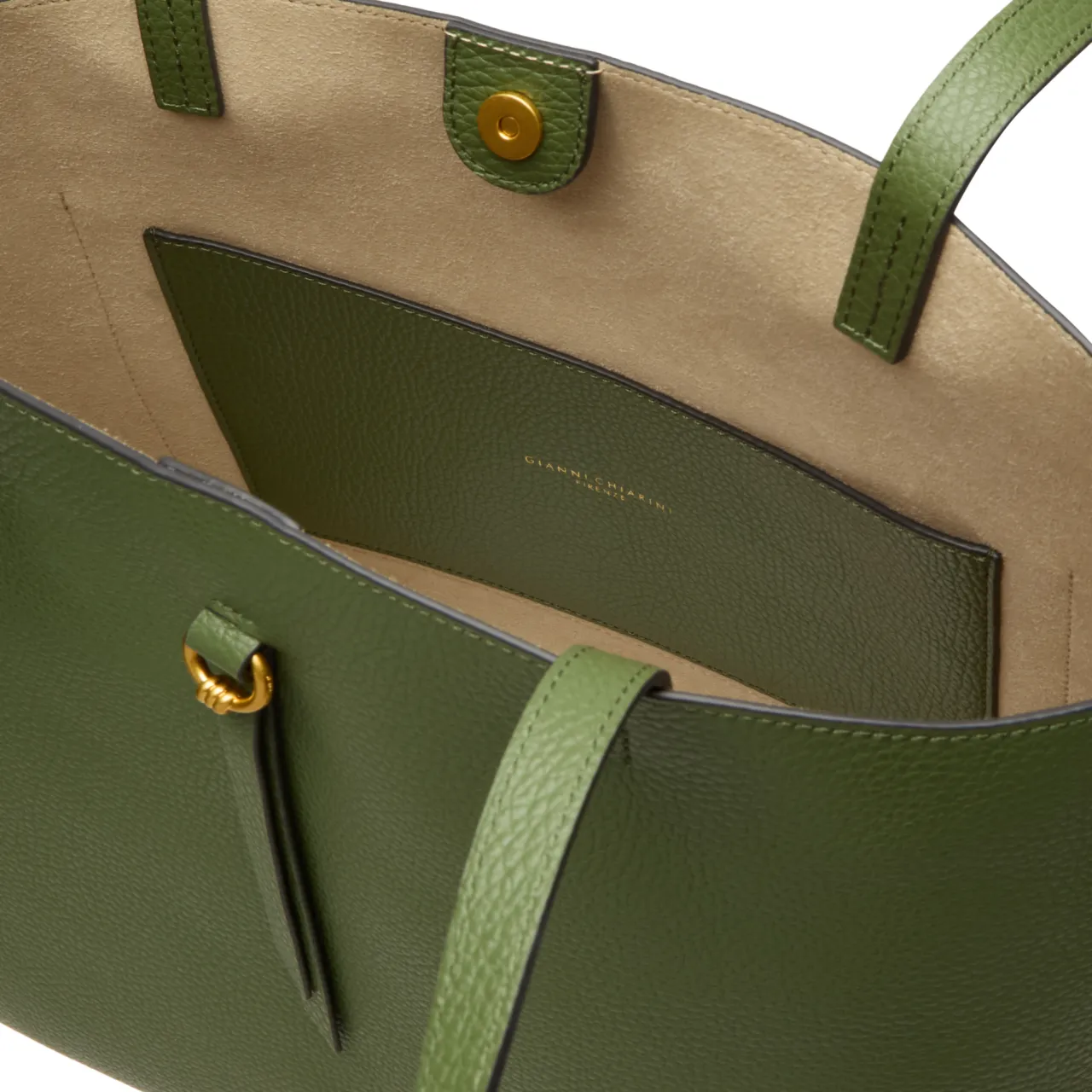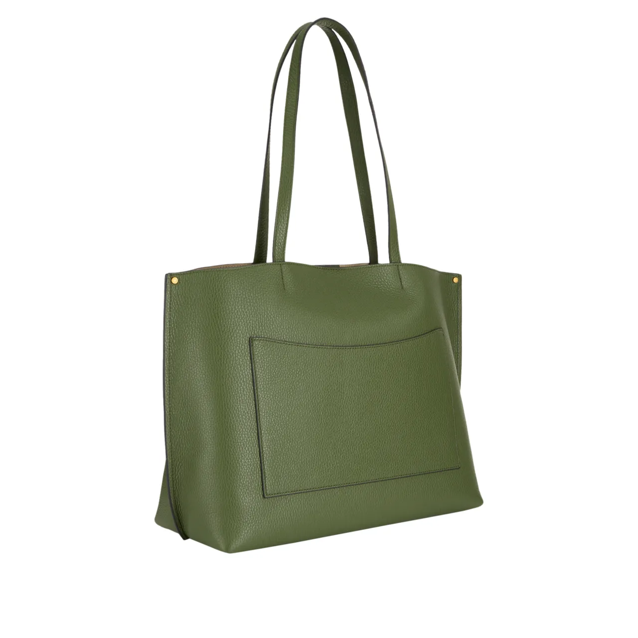 - Top carry handles, magnetic button closure, gold-tone hardware, tab detailing, grained finish, foil logo print