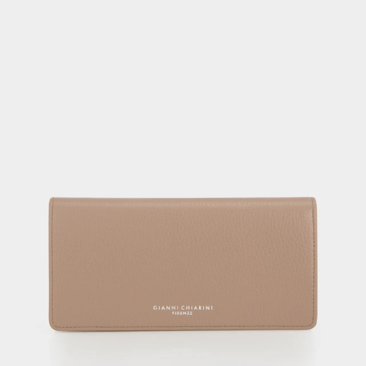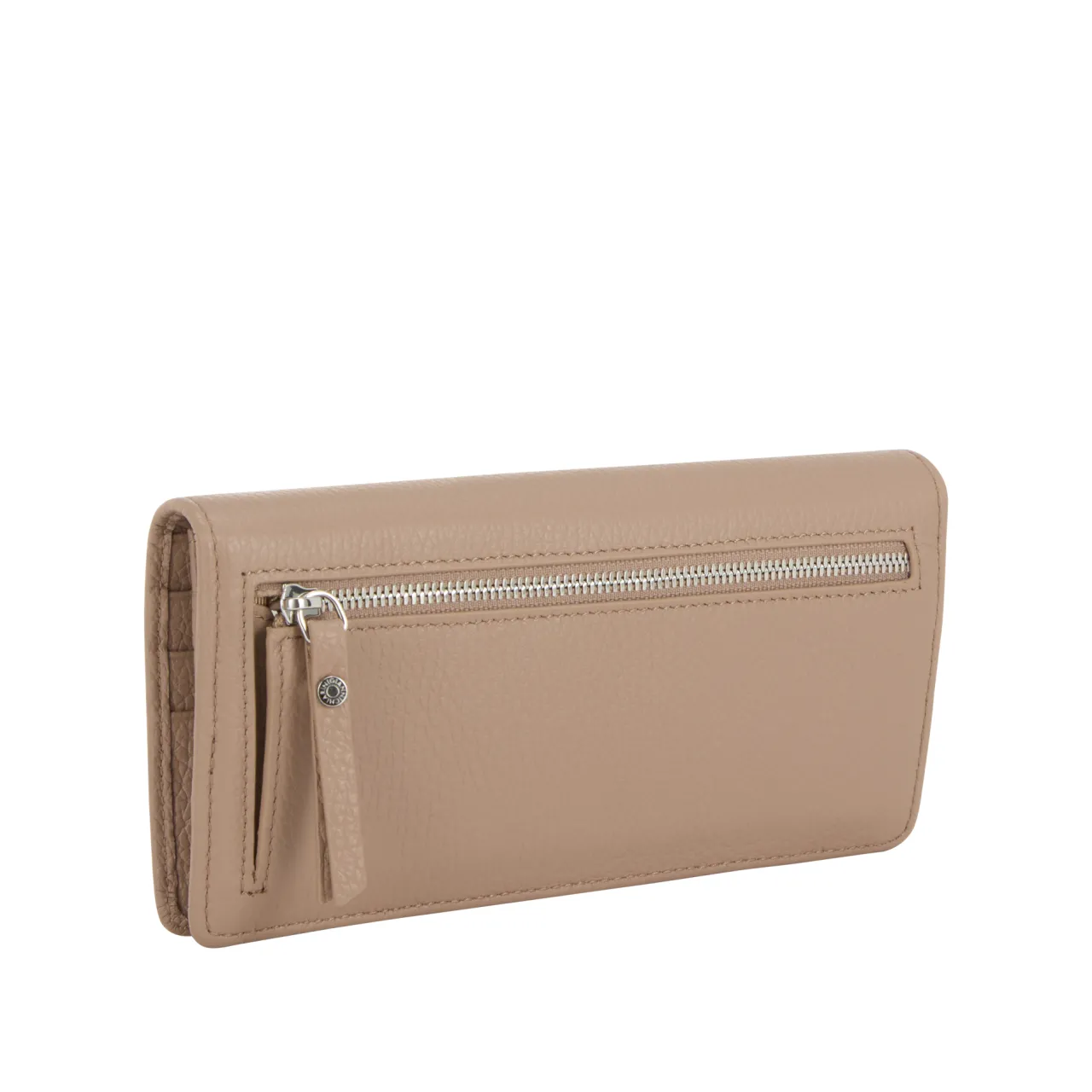 - Flap front with snap-button closure, silver-foil logo branding, back zip-fastening pocket, grained leather finish
