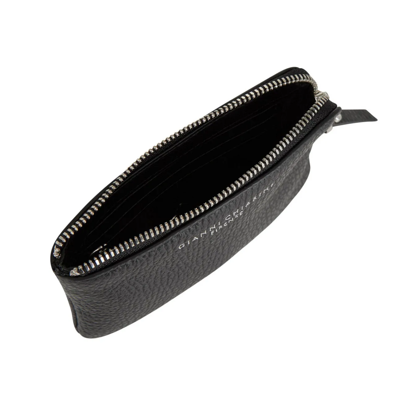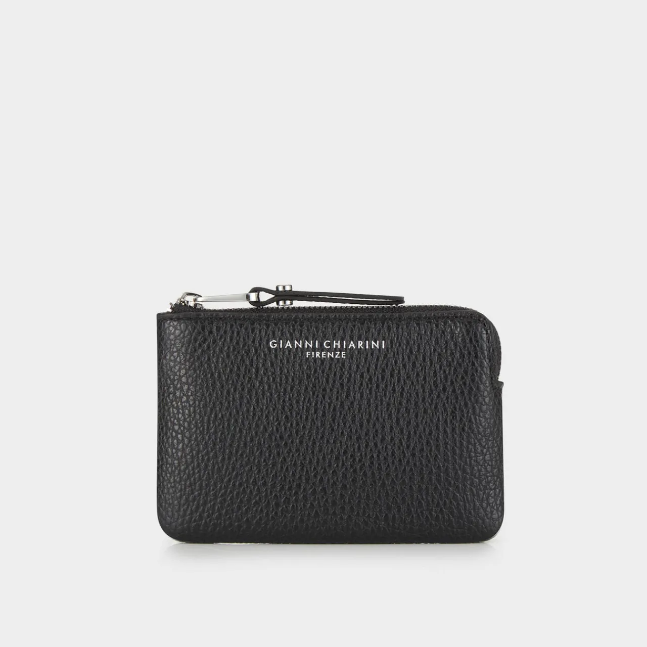 - Top zip fastening, silver-tone hardware, three card slots, one coin compartment, keyring attachment, logo detail, tonal stitching, pebbled leather finish