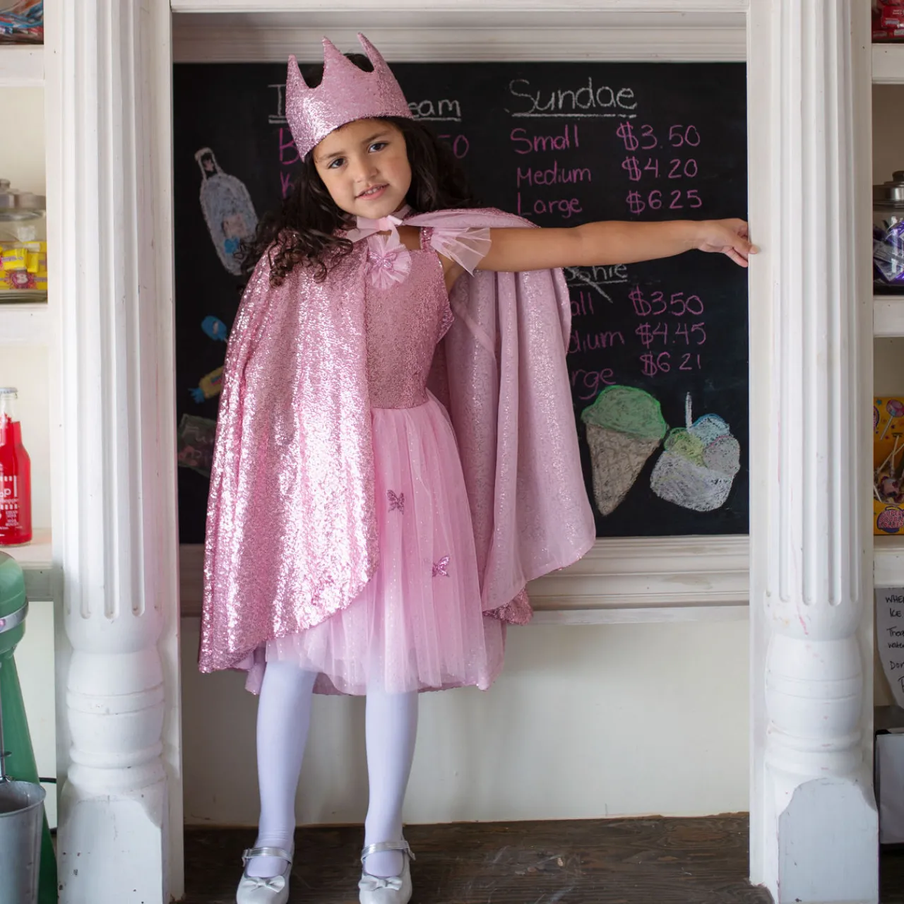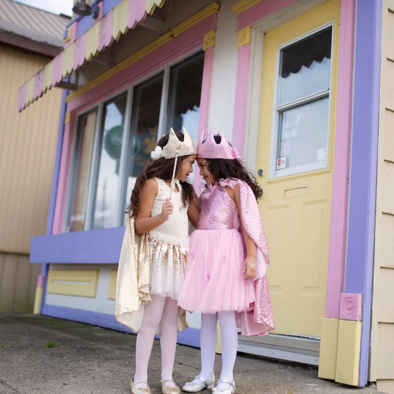 - Two-piece set, soft pink tulle gathers, full skirt, sequin top, tulle sleeve accents, glitter-printed wings