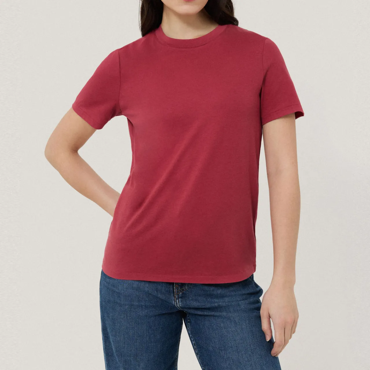 - Supima cotton, sheen finish, crew neck, straight silhouette, short sleeves