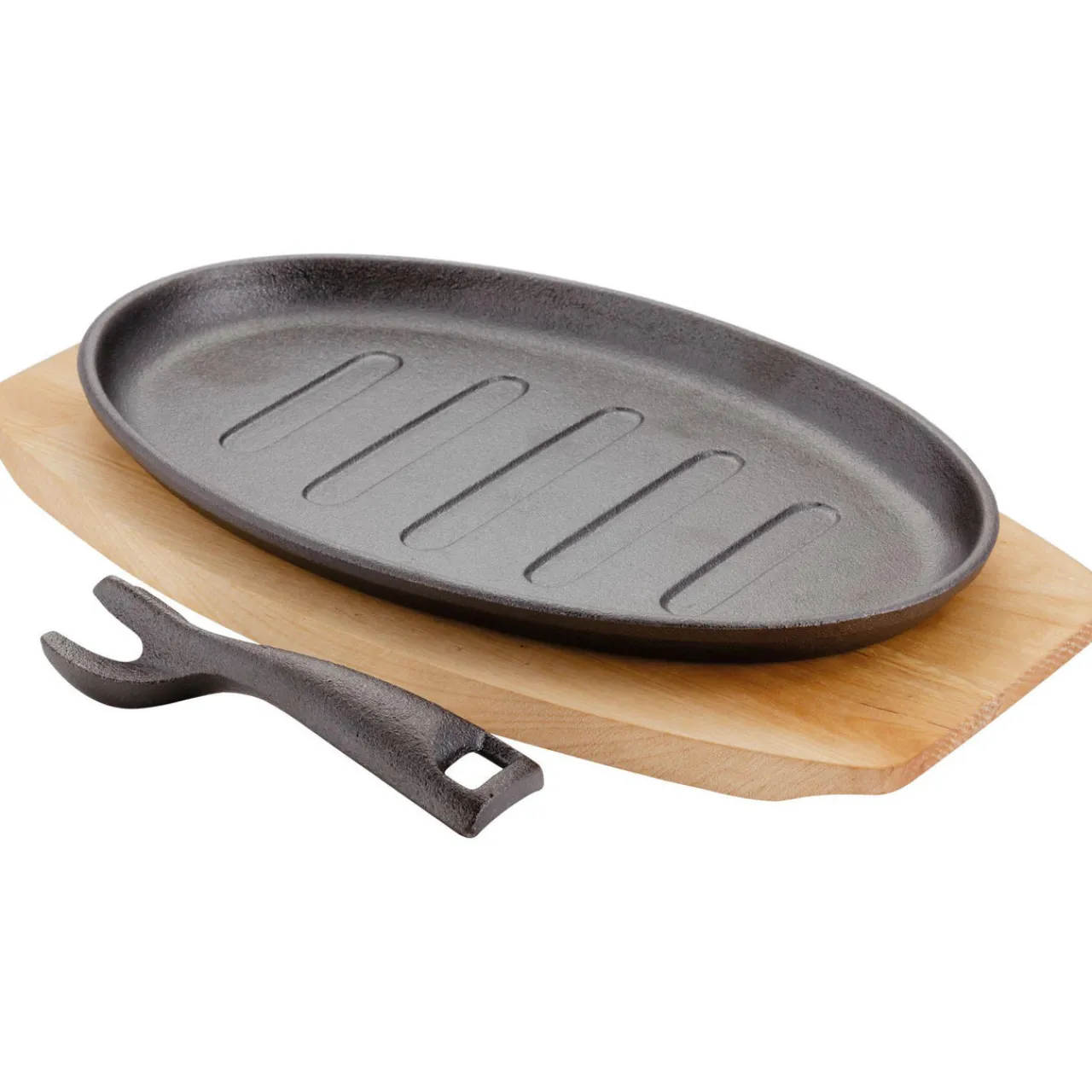Sizzle & Serve 26 x 17cm Platter. Created in durable cast iron for excellent heat conduction and retention. With heat-resistant maple wood serving stand. From oven to table, retains heat while serving and keeps food hotter for longer. Cast iron body suitable for BBQs.