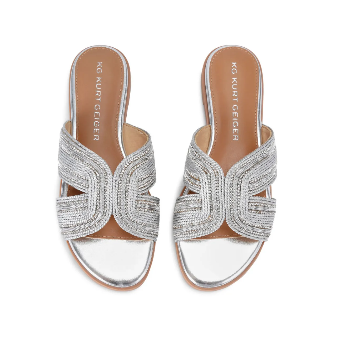 - Slip-on style, rope and crystal embellishment across the cut-out strap, flat sole