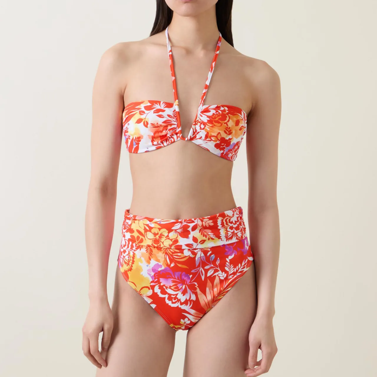 - Halter neckline with adjustable tie-fastening straps, bandeau style cups, floral pattern with contrasting colours, back clasp