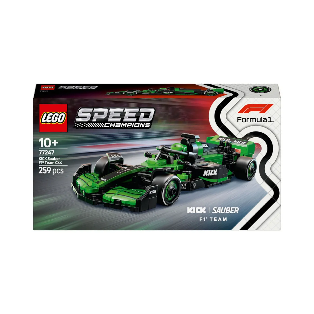 - 259 pieces, 1 minifigure, authentic KICK Sauber F1® Team details including a rear wing, sponsor stickers and wider rear tires imprinted with ‘Pirelli’