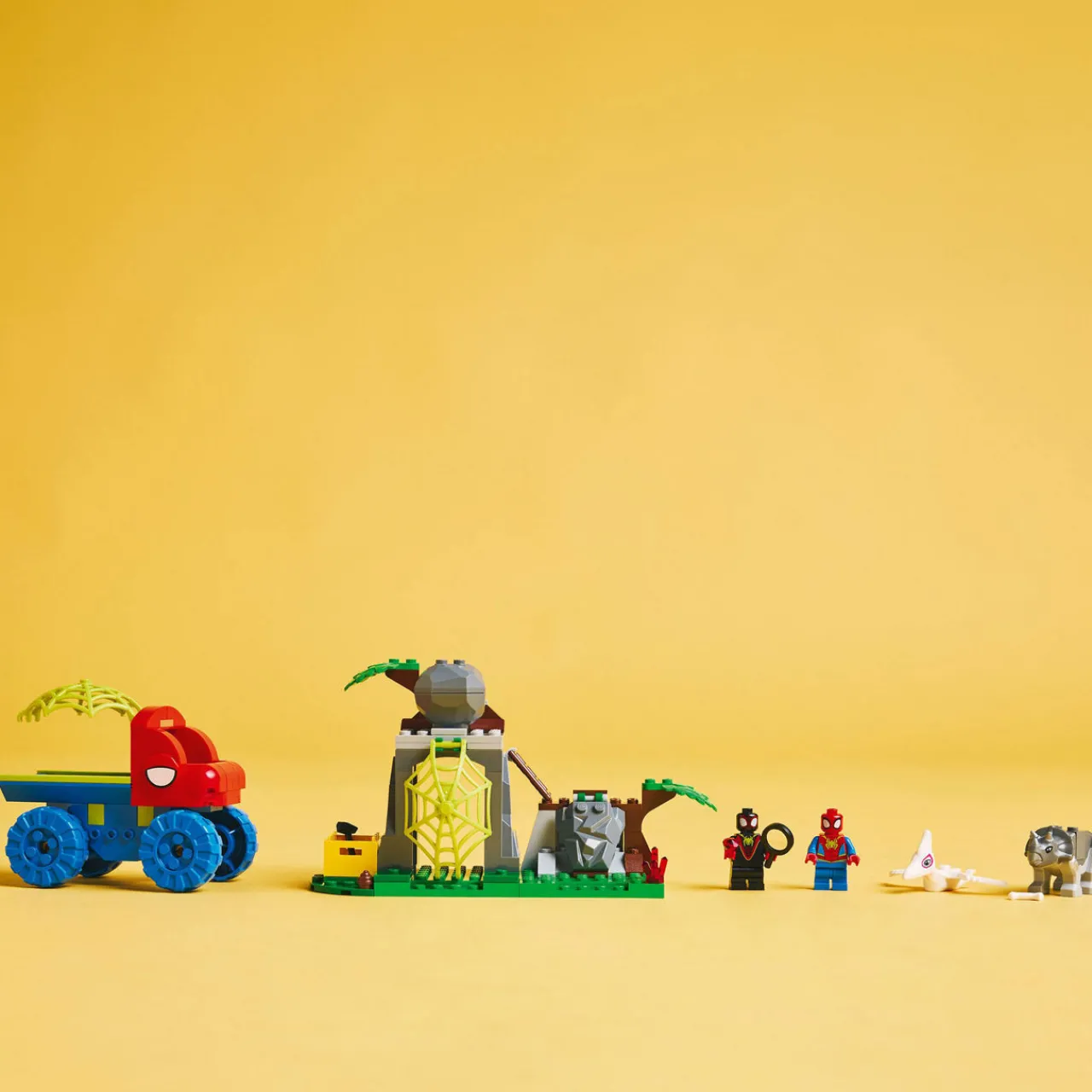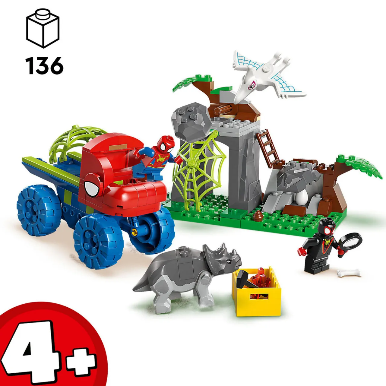 - 136 pieces, buildable dino-truck toy with a large web attached to the rear, a trigger-operated rock-fall feature, a dinosaur egg to reveal, and a web that can be lowered to trap the villain; Spidey and Miles “Spin” Morales minifigures, 2 buildable dinosaur figures: Ghost-Spider as a pterodactyl and Rhino as a triceratops and fun role-play accessories
