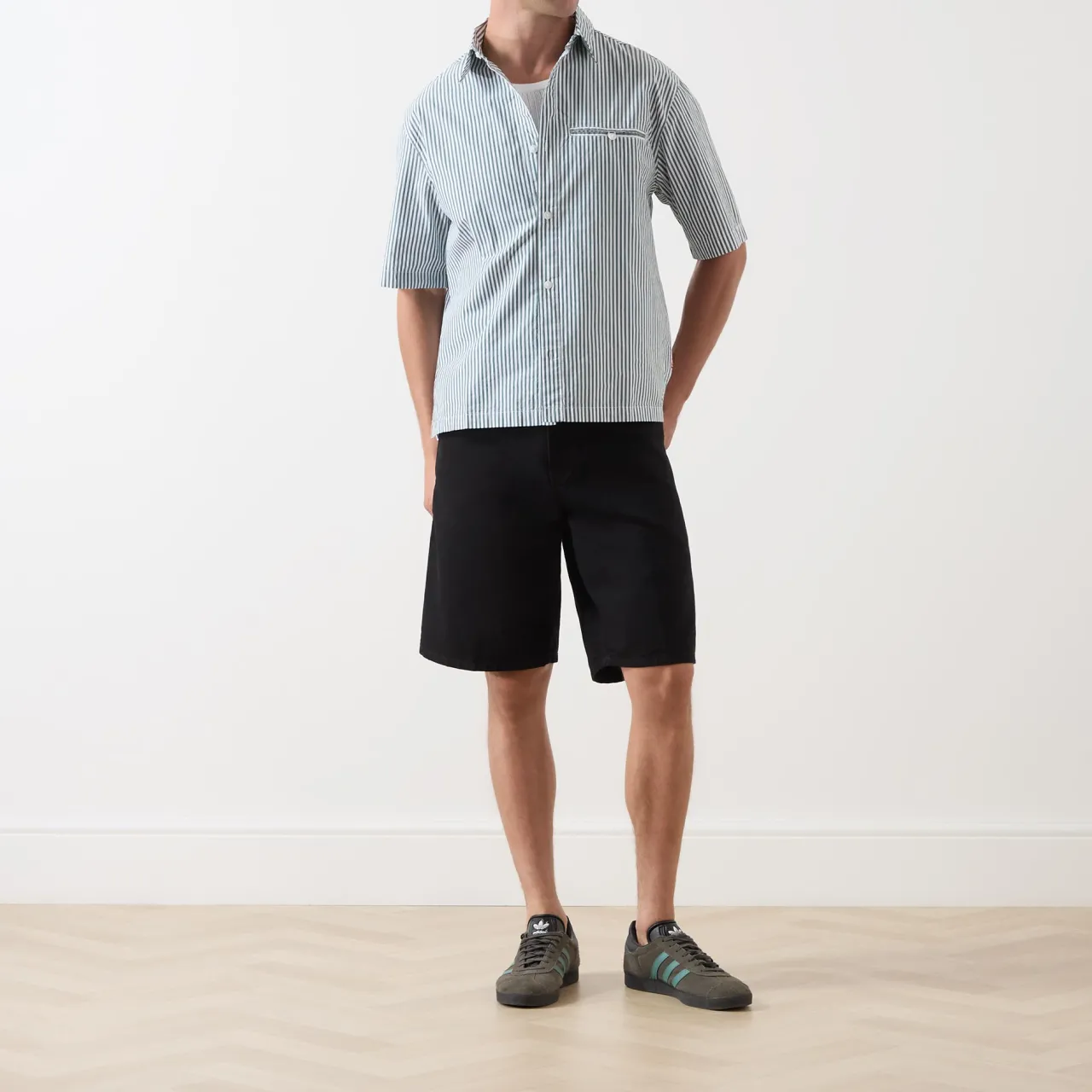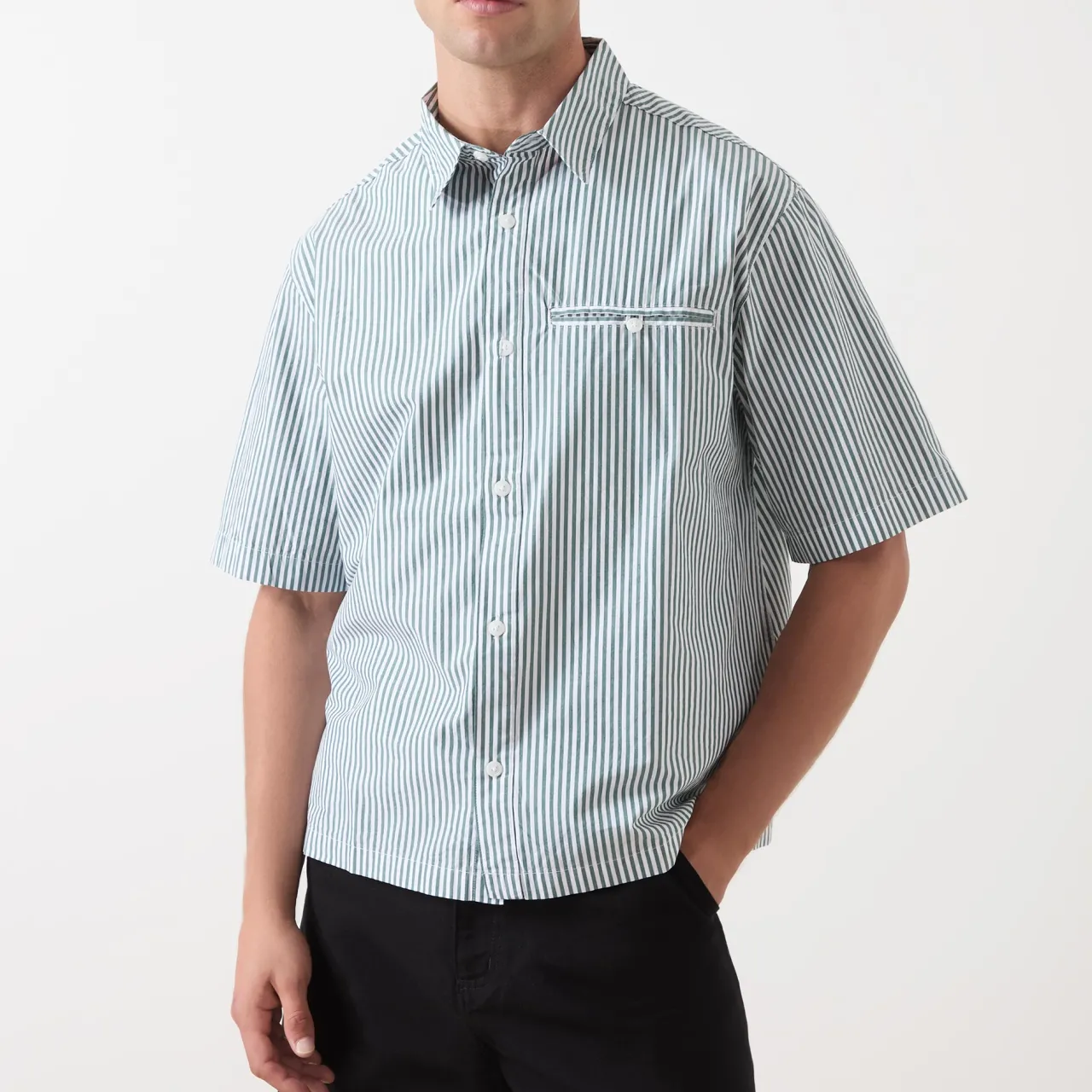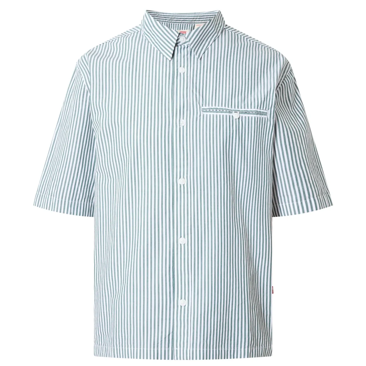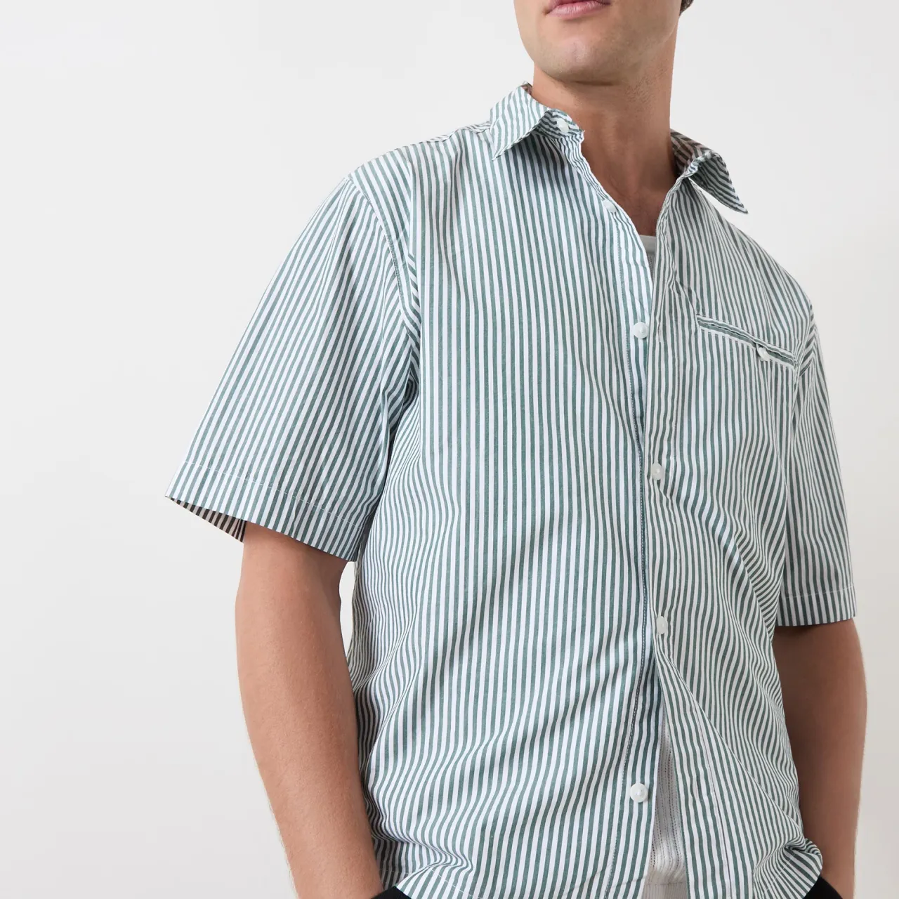 - Pointed collar, short sleeves, button fastenings, dropped shoulders, chest welt pocket with button fastening, pinstripe pattern, tonal stitching, straight hemline, smooth fabric